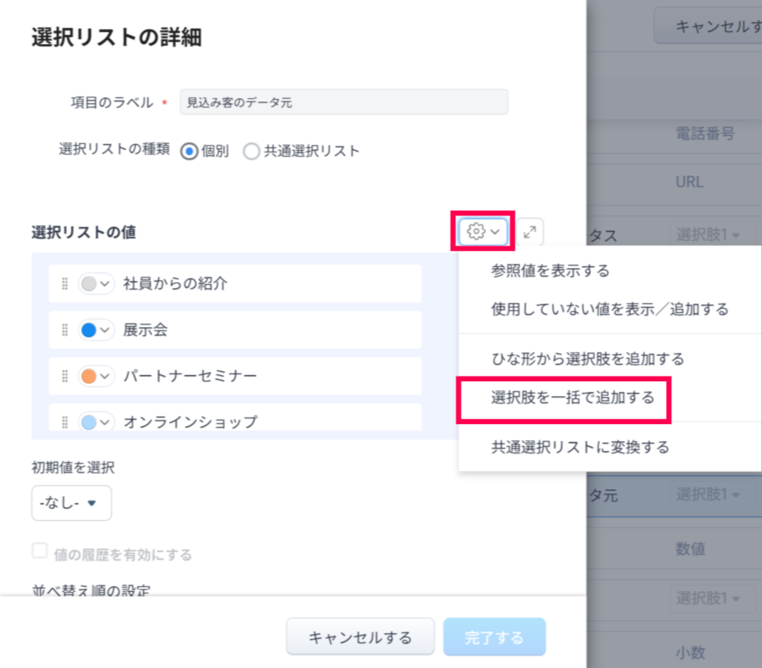 なお、設定アイコンをクリック後の「選択肢を一括で追加する」オプションから、選択肢をまとめて追加することが可能です。