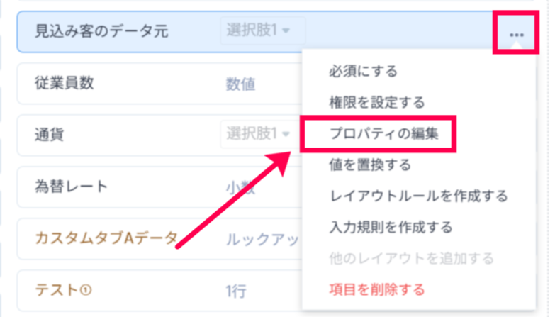 - 見込み客タブのレイアウト内にある「見込み客のデータ元」項目へ移動し、項目右の・・・>「プロパティの編集」をクリックします。