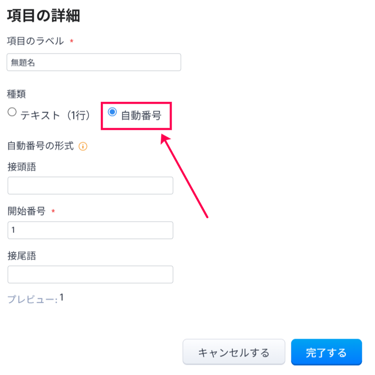 (カスタムタブ名)項目右の・・・>「プロパティの編集」より、項目の種類として、自動番号を設定することが可能です。