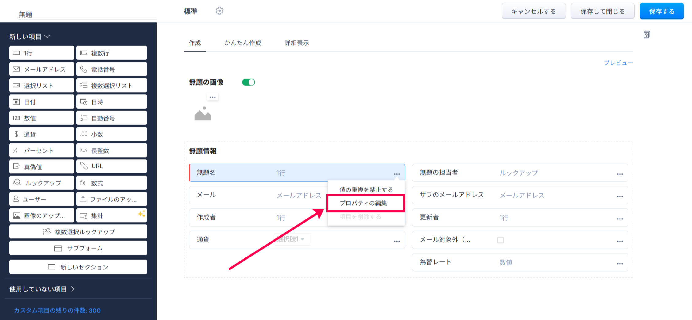 これにより、カスタムタブでデータを作成する際に、データ名として、このプロパティ編集画面で設定した形式にて自動で番号が設定されます。