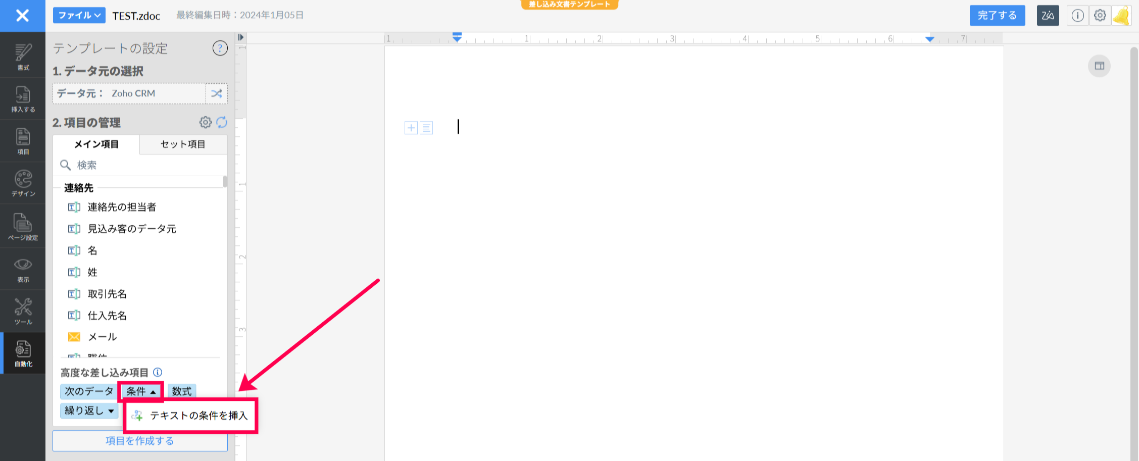 差し込み文書のテンプレート作成画面にて、「自動化」タブ内にある「高度な差し込み項目」より「条件」要素をご活用いただきますと、