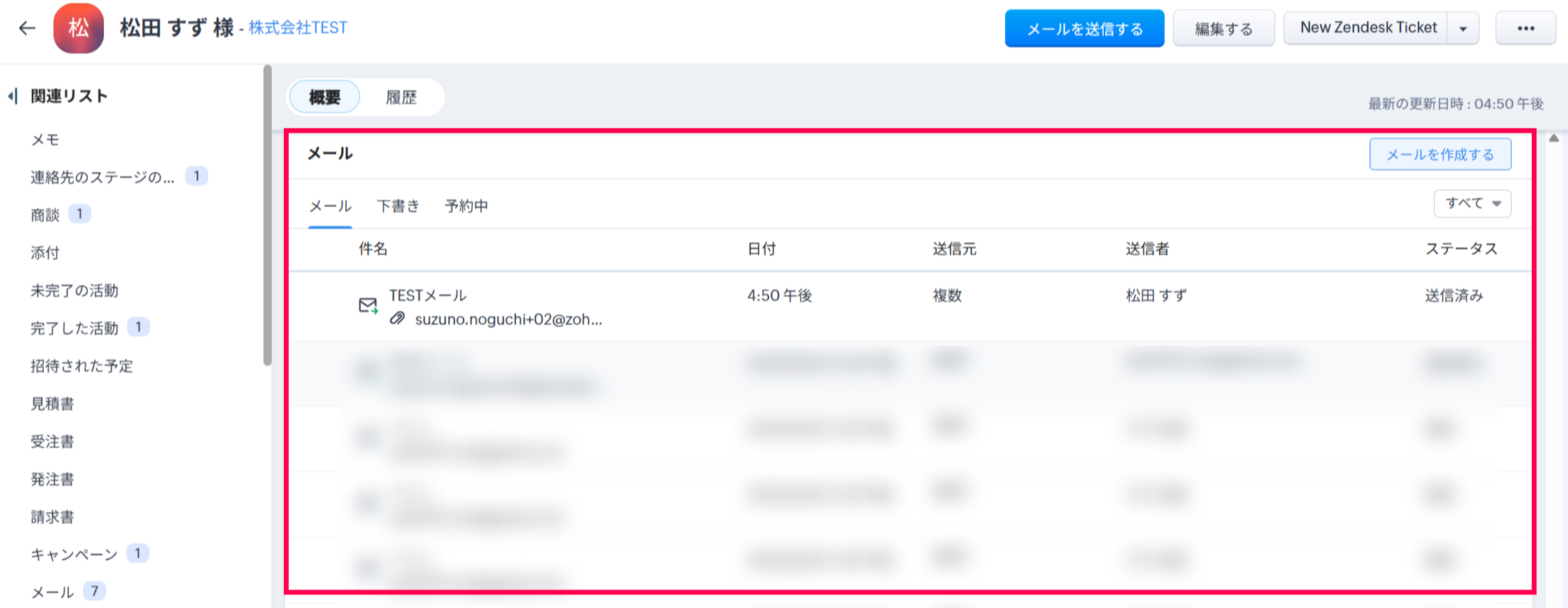 ・メールを送信した連絡先詳細画面内のメール関連リスト