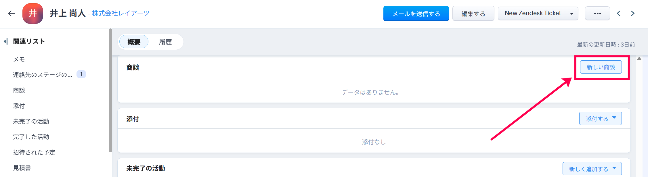 各データの詳細画面の「商談」関連リスト内にある「新しい商談」ボタンより商談を作成すると、