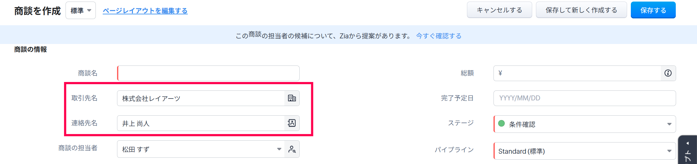 デフォルトの「連絡先名」、「取引先名」項目に該当の連絡先名やその取引先名が自動的に反映された状態で、商談作成できます。
