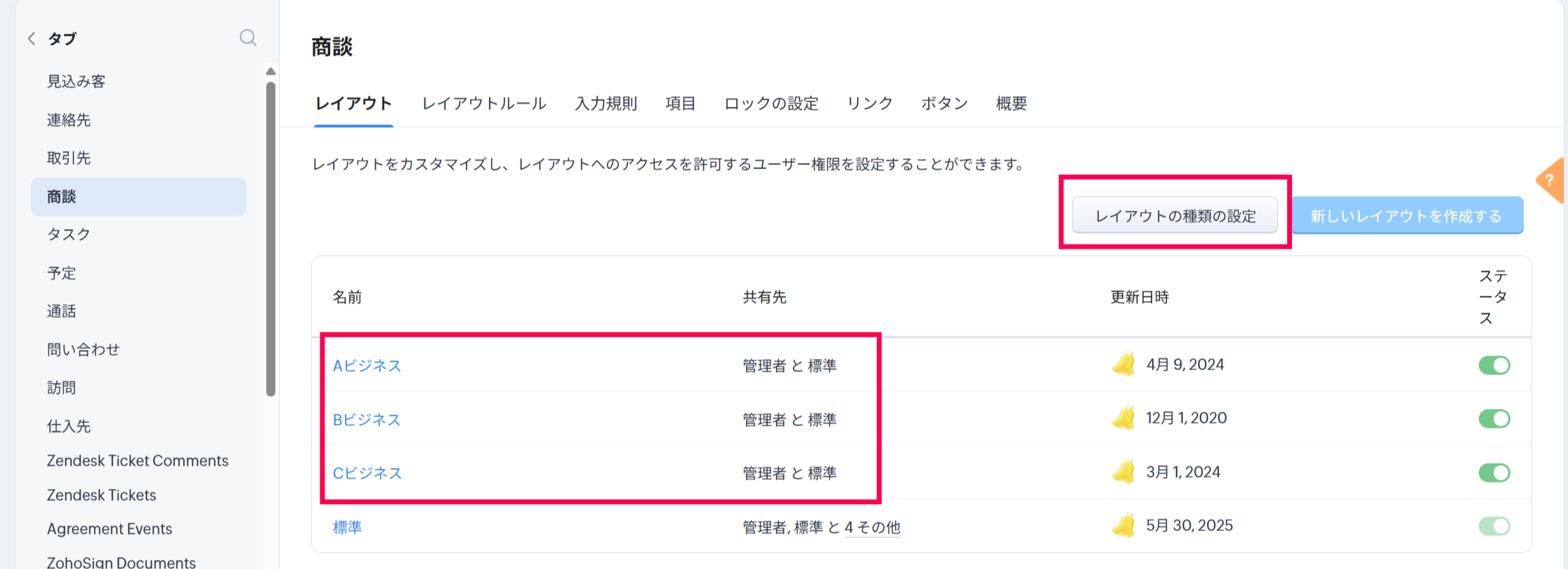 各ビジネスに合わせ、商談のレイアウトを作成します。(今回のケースでは3つ作成します。)