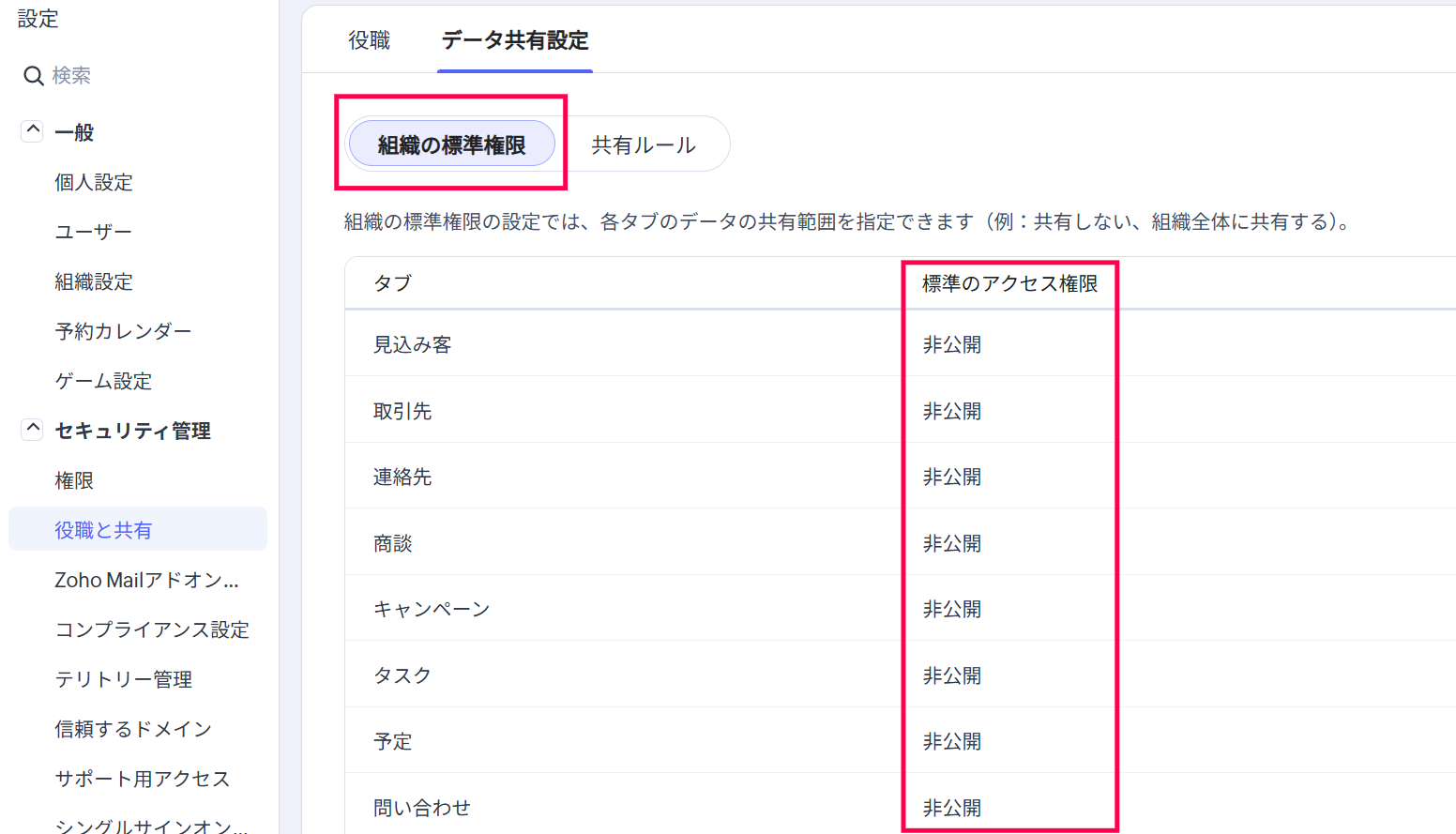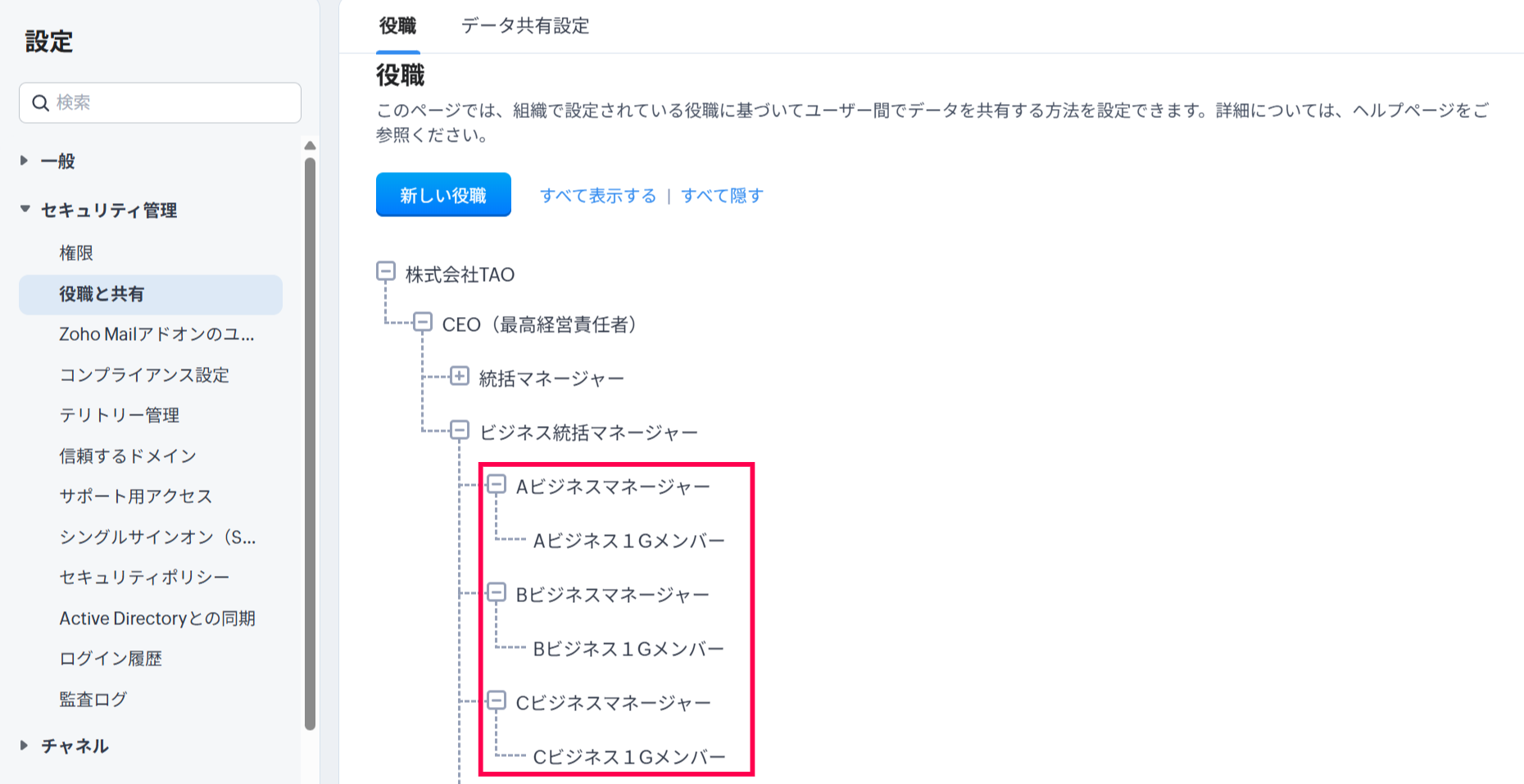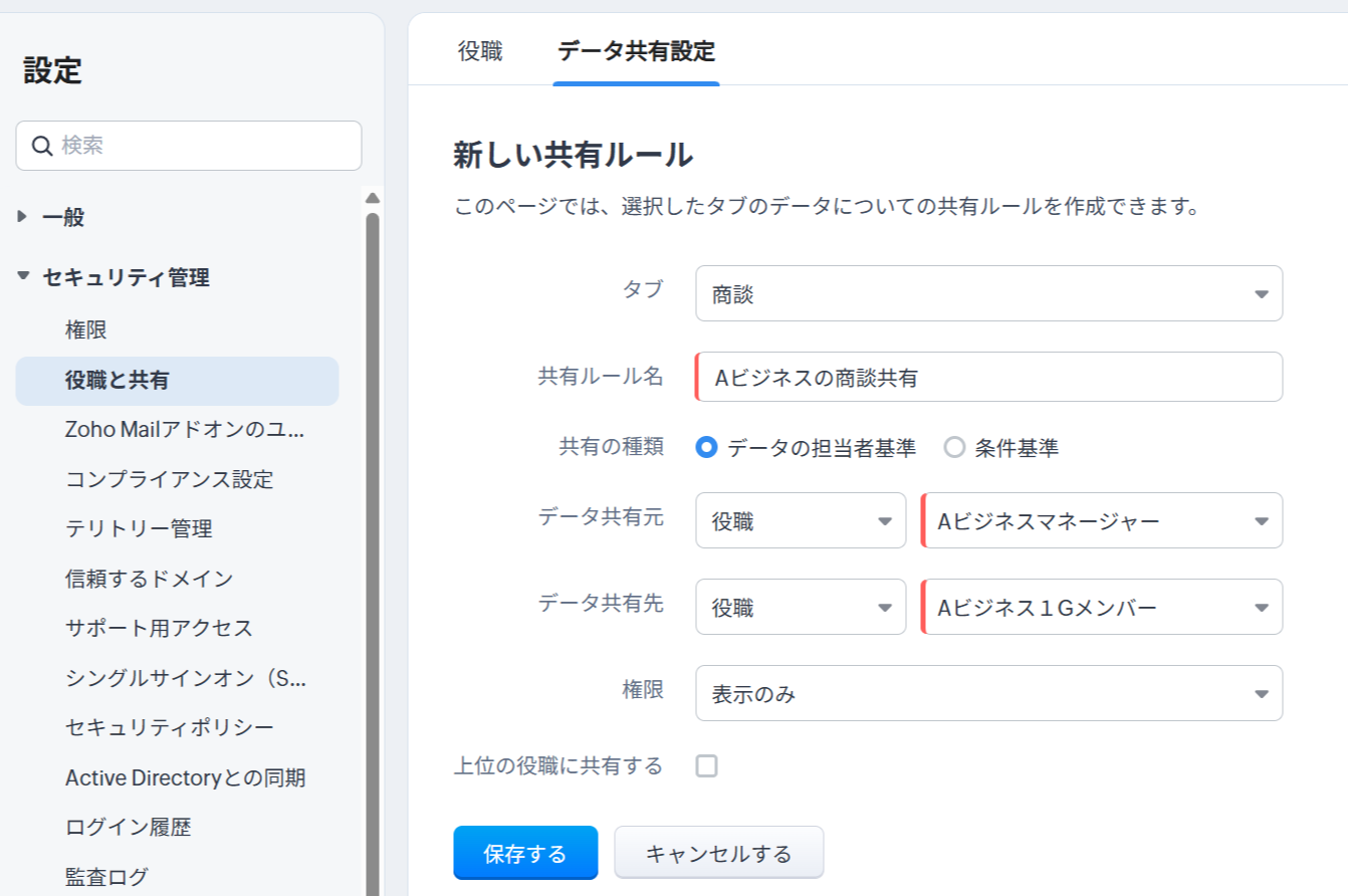 組織のデータ閲覧/共有の範囲に応じて、役職間のデータ共有ルールの設定を行っていただければと存じます。