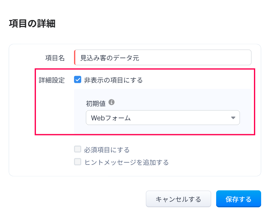 Webフォーム内に、「見込み客のデータ元」項目を設置し、項目右横にある設定アイコンをクリックし、「非表示の項目にする」オプションを有効化します。その際、非表示の項目の初期値をWebフォームに設定します。