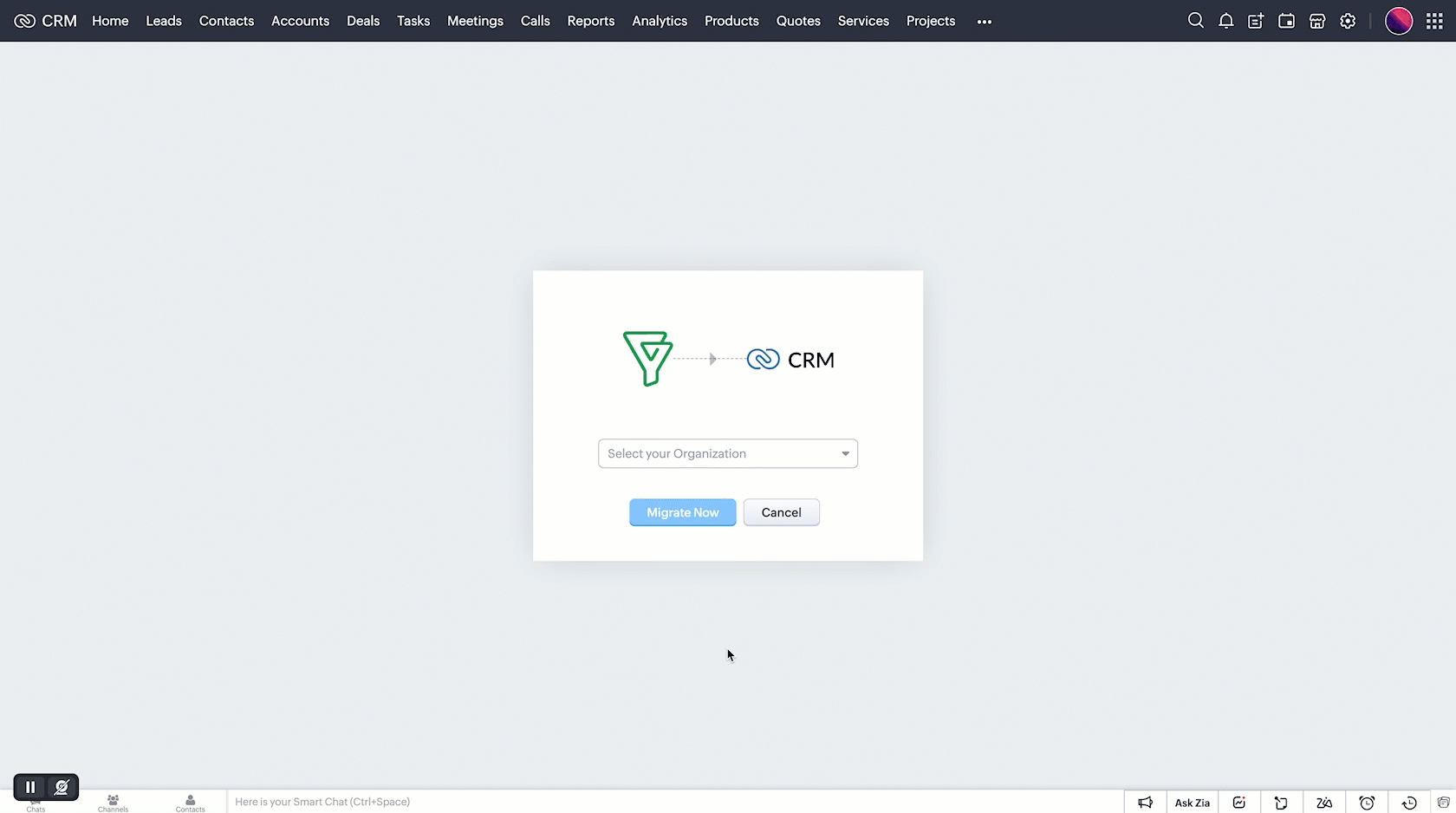 - Biginからのデータ移行を開始するには、同じユーザー情報でZoho CRMにログインする必要があります。