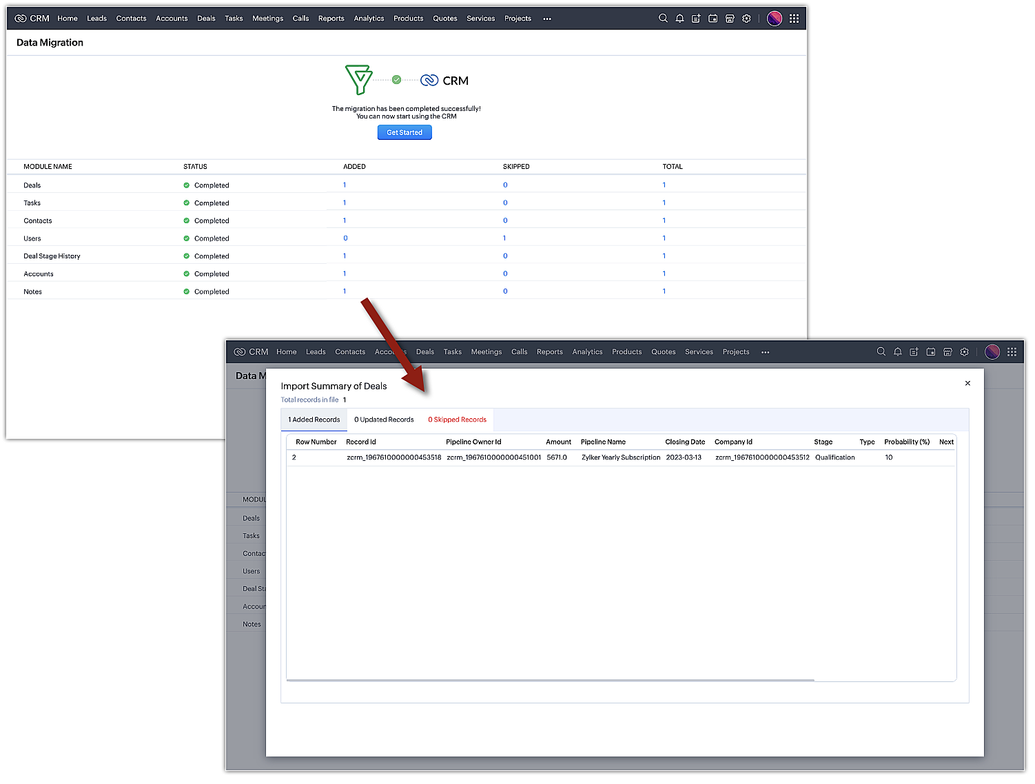 移行が完了すると、追加またはスキップされたタブのデータの詳細と、処理されたデータの総数が表示されます。データの件数をクリックすると、データのIDやパイプラインの担当者IDなどの詳細を見ることができます。