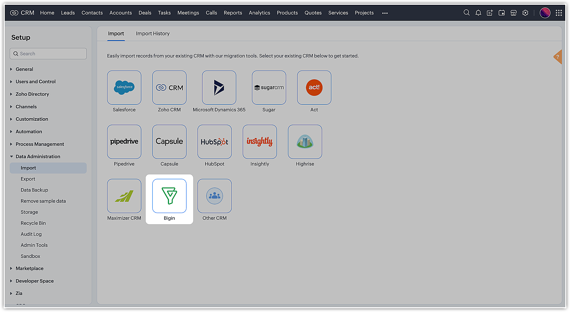 データを移行するには、Zoho CRMにログイン後、設定>データ管理>インポート画面へ移動し、Biginを選択します。