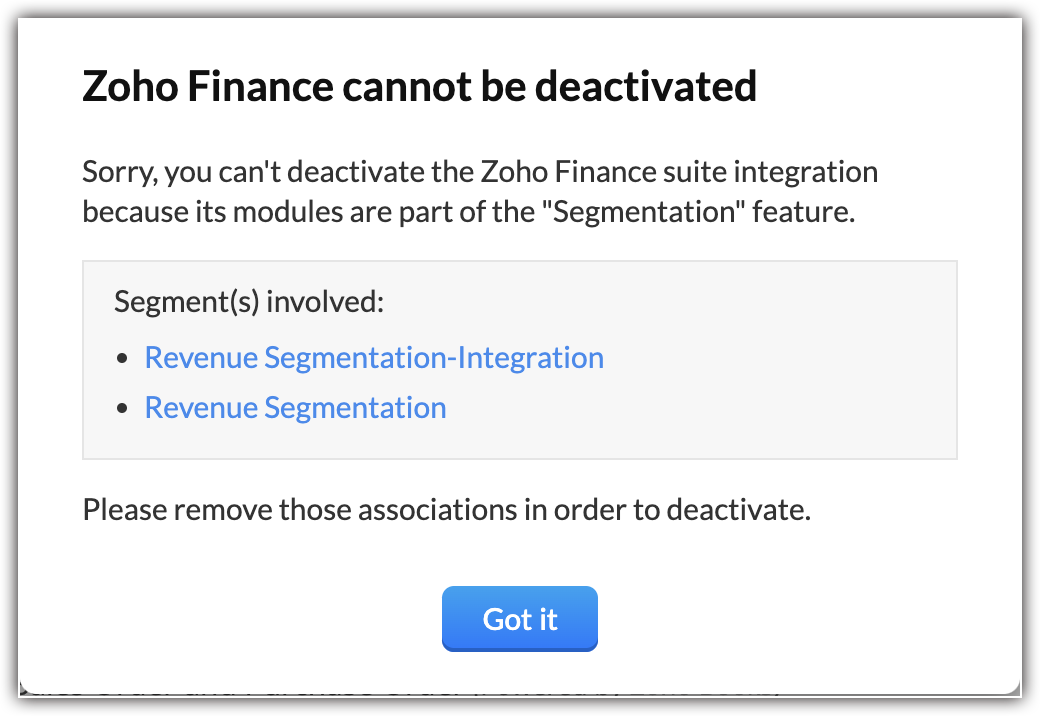 CRM内に有効なセグメンテーションが設定されている場合、Zohoの会計サービス(Zoho Finance Suite)連携を解除することはできません。