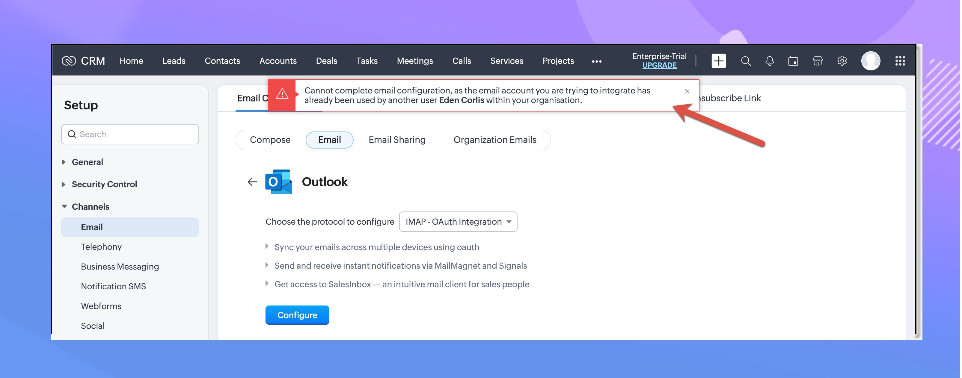 機能アップデート前は、ユーザーがメールアカウントを設定しようとして認証ポップアップを閉じると、そのメールアドレスのメール連携がCRMに保存され、「アカウントはすでに追加されています」というエラーが表示されていました。