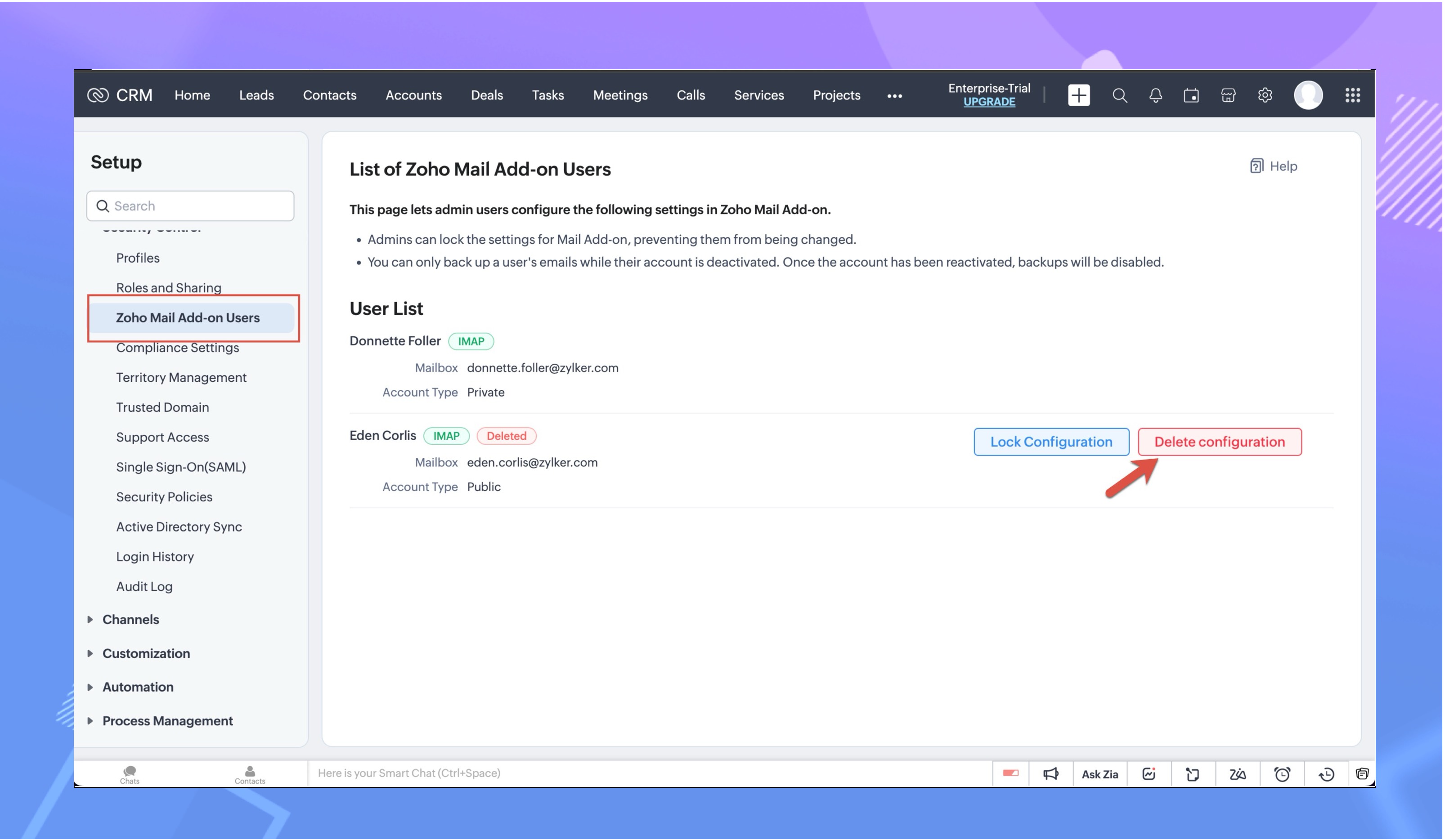 管理者ユーザーは、「Zoho Mailアドオンのユーザー」設定画面内の「設定を削除する」オプションにアクセスすることで、削除されたユーザーの設定を削除することができます。