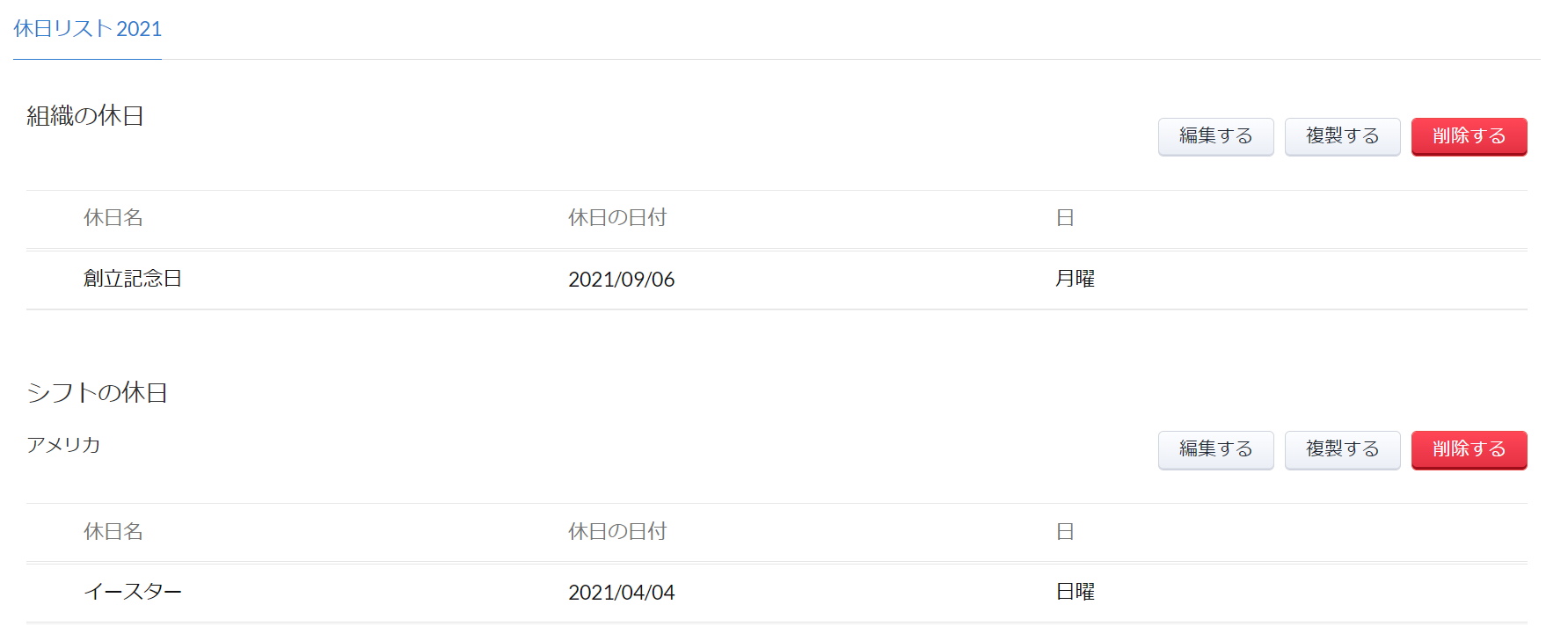例えば、すべてのシフトに対する2021年度の組織の休日リストがある場合でも、2021年度のアメリカの休日リストが作成できます。