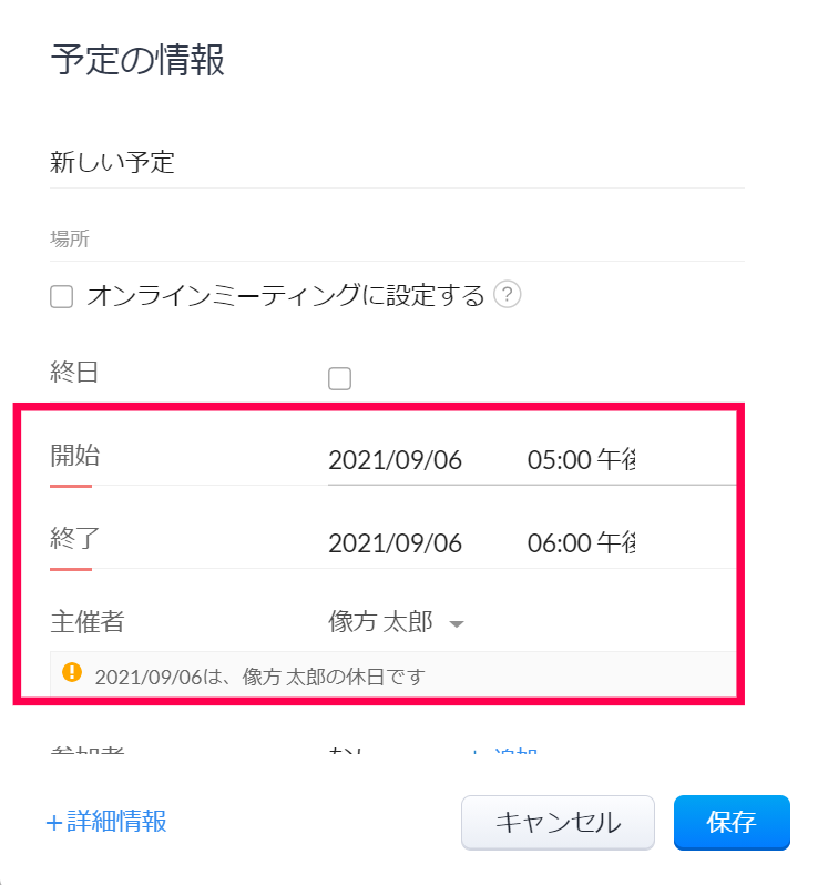 組織の休日に対し予定を作成しようとした際には、アラートが表示されます。