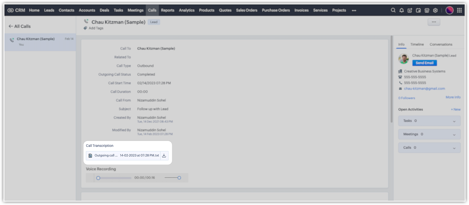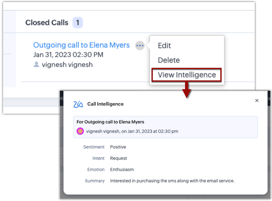 Zoho CRMの以下の箇所で、Ziaの通話の分析詳細を確認できます。