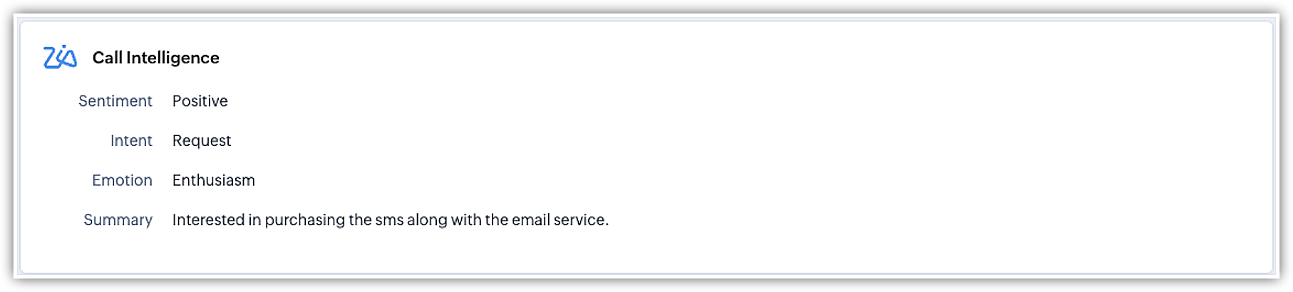 テキスト変換された通話データのすべてに目を通すことなく、Ziaは印象、感情、意図を分析することにより、通話全体の調子を自動的に決定します。また、通話内容を1~2行で要約することも可能です。