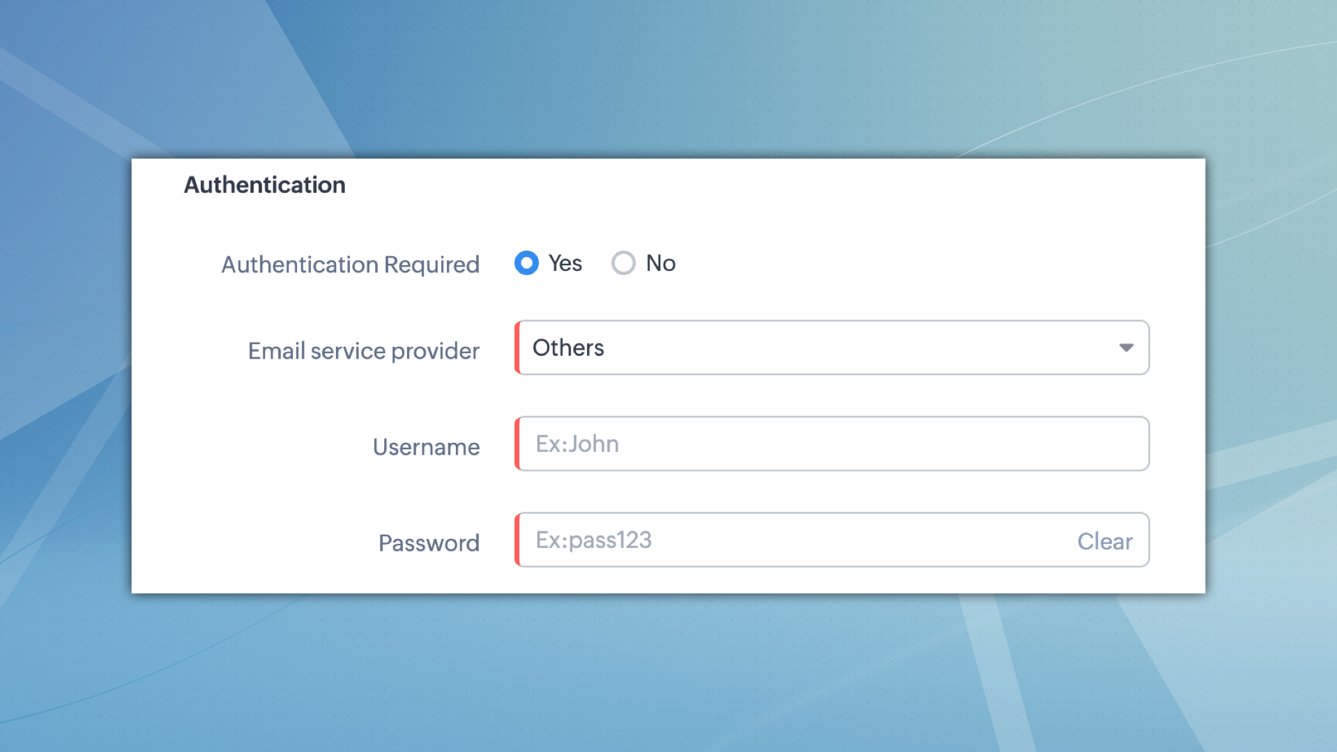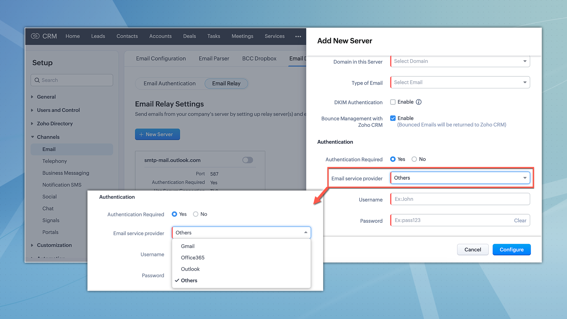 これらの新しい変更を補完するために、メールリレー機能の設定プロセスを強化しました。「認証」セクションの下に「サービスプロバイダー」という新しい項目が追加され、メールサービスプロバイダーを選択できるようになりました。選択されたオプションに基づいて、Zoho CRMは、OAuthログインまたはパスワードによるログインにて認証します。