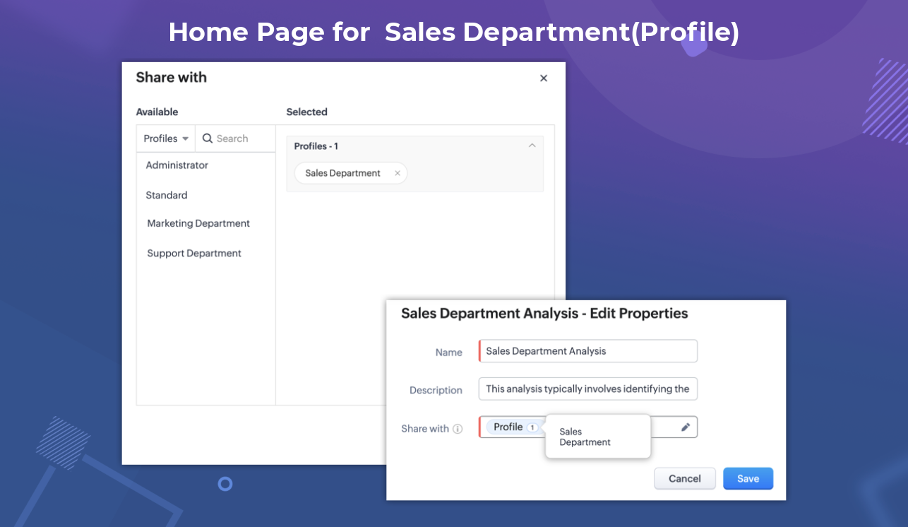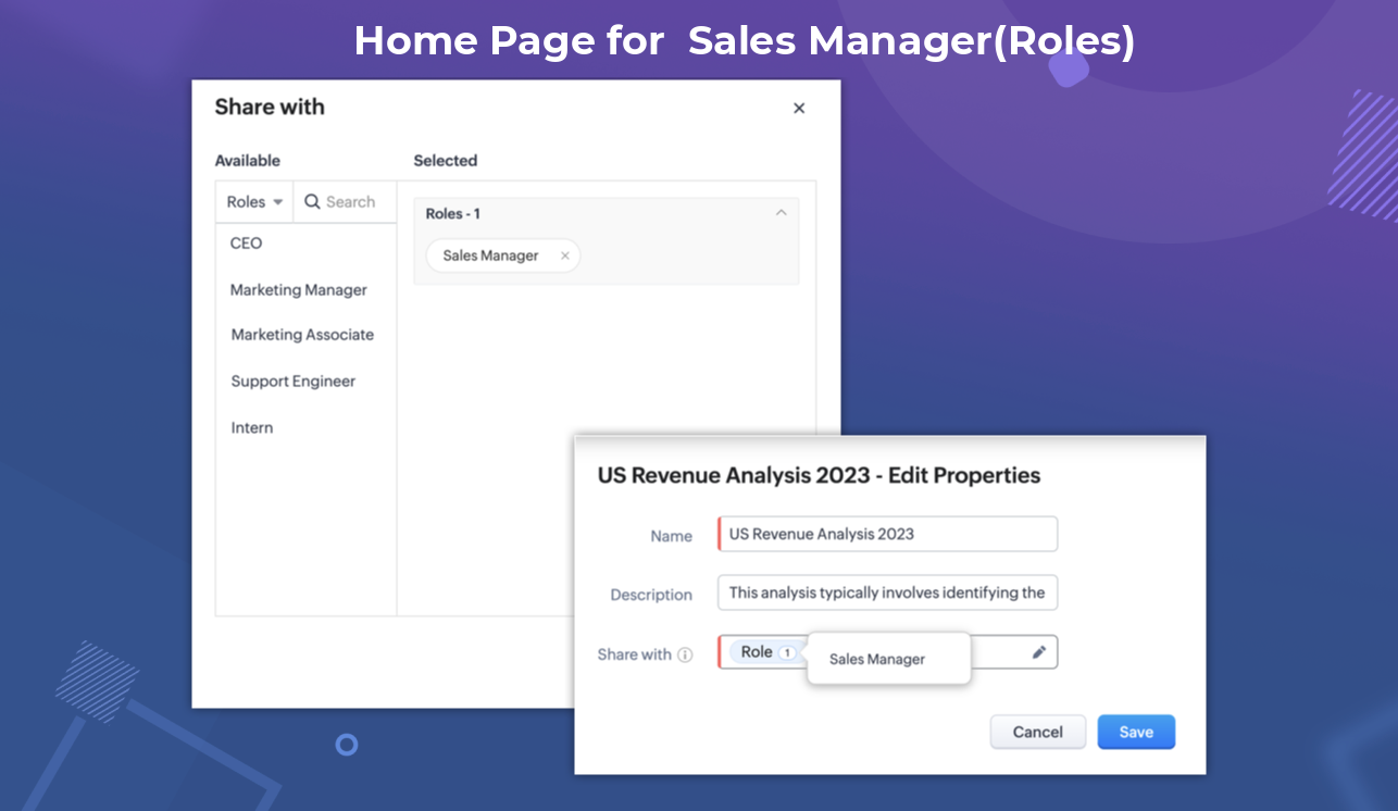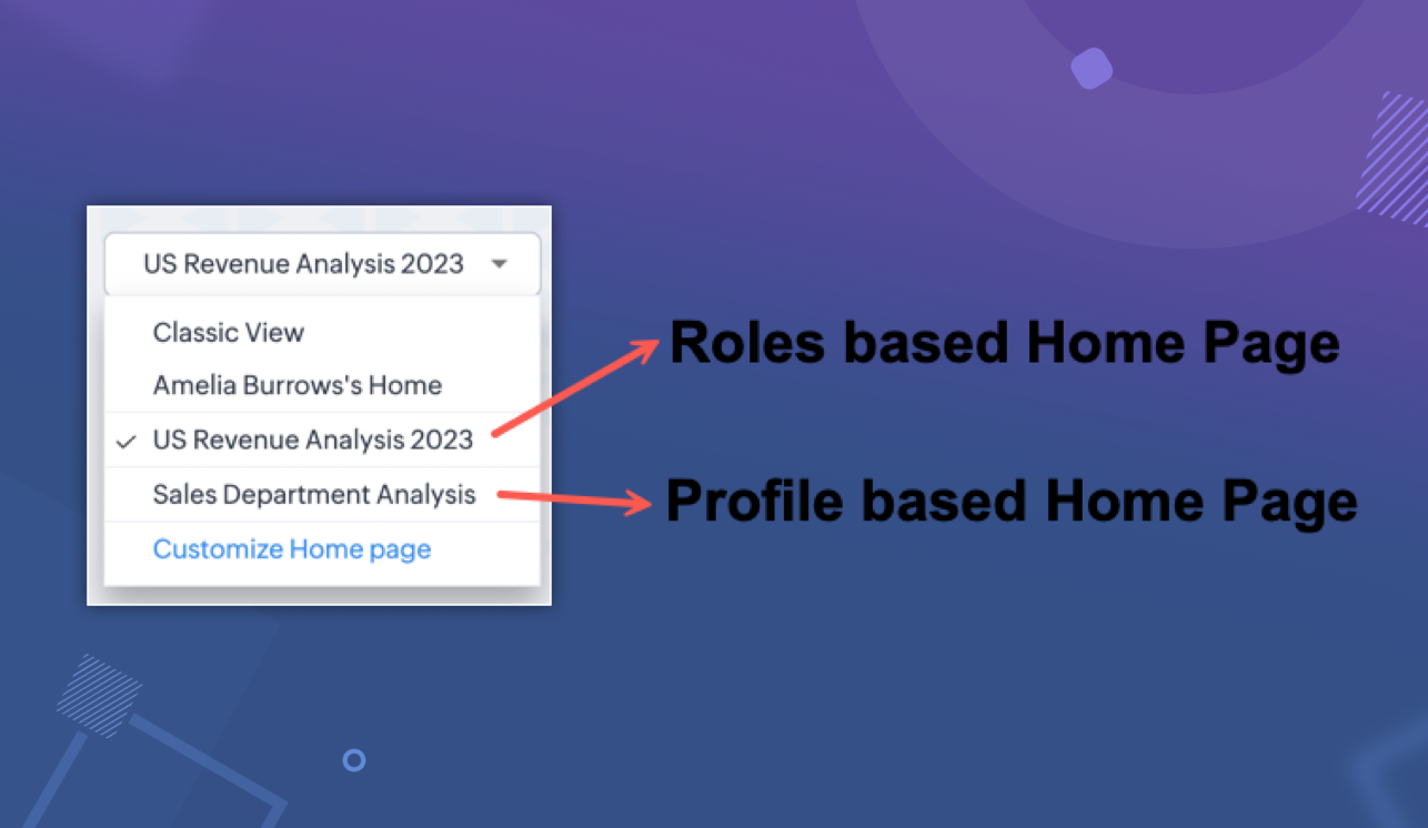 例えば、Zylker社には、米国内の営業マネージャー(役職)用のホームページがあり、米国内の営業部(権限)用の別のホーム画面も管理しており、アメリアというZylker社の営業部マネージャーがいたとします。
