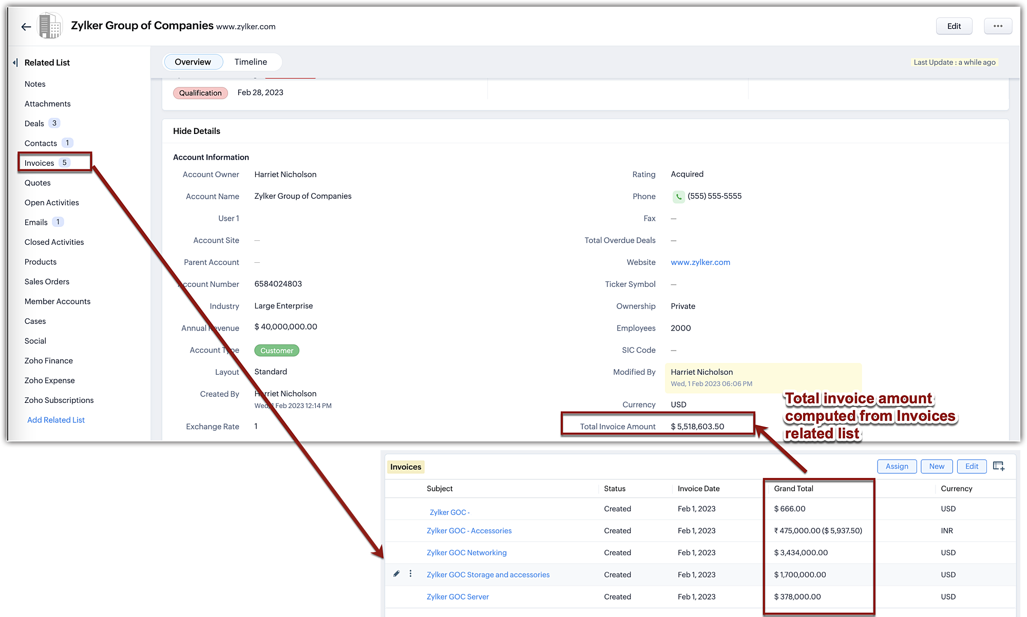 しかし、効果的なデータ管理を行う場合、単なる関連付けだけでは十分ではありません。親データと関連データの間に相互運用可能なデータ関係と呼ばれるものが必要です。CRMにおいては、関連リストの値を親データ情報自体に関連付ける機能が、集計機能の前提となっています。