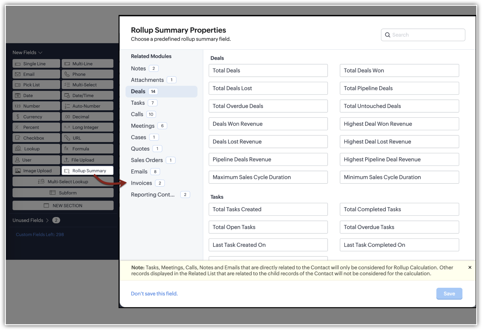 - 集計項目は、タスク、通話、予定、および予約タブを除くすべてのタブで使用できます。