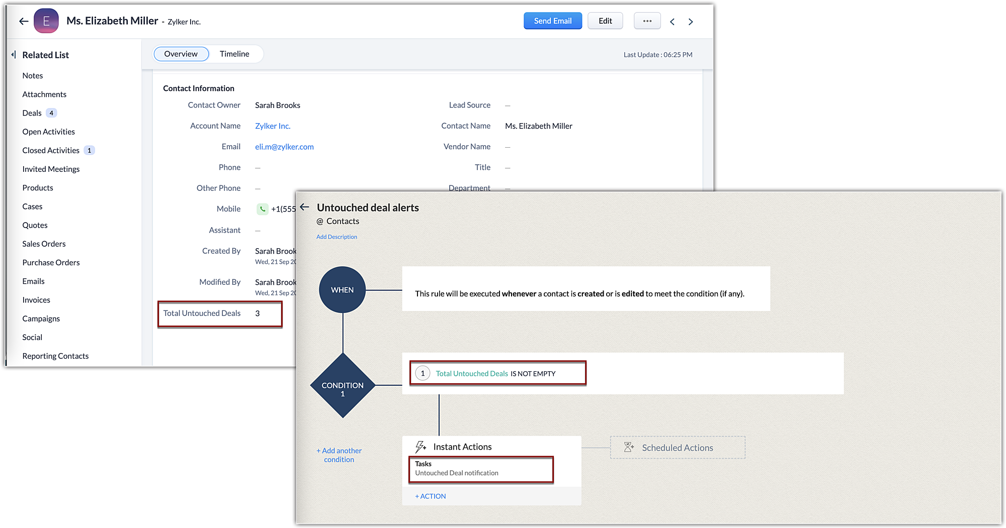 未処理の商談とは、何のアクションも行っていない商談を指します。このような商談は、停滞するだけでなく、ビジネスにとっても不利な状況になります。しかし、日々多くの商談が発生するエンタープライズビジネスでは、手動で未処理の商談を特定し、フォローアップすることは、機会損失となりかねません。未処理の商談を確認するため、連絡先タブに未処理の商談の件数を表示する集計項目を作成することで、素早くフォローアップや自動化処理を行うことができます。