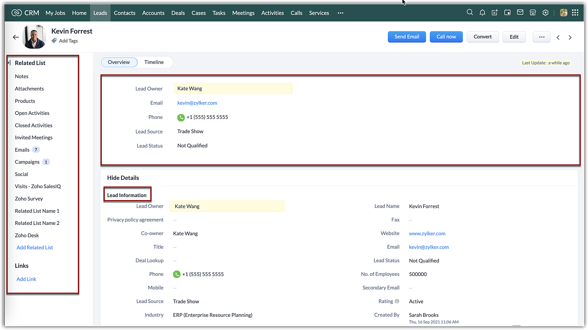 例えば、見込み客タブについて考えてみましょう。見込み客のデータには、見込み客に関する情報、その活動、その他次のアクションを決定するのに十分な関連情報が含まれています。このような関連付けは、データにアクセスするための基礎となります。
