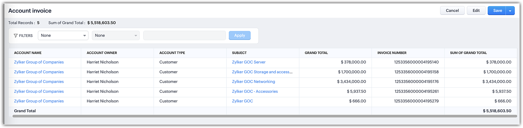 集計項目をタブ内に追加すると、その取引先で作成された請求書の合計額を自動で取得することができます。これにより、レポートを作成するために費やした多くの時間と労力を削減できます。また、集計項目が追加されると、そのレイアウトのすべてのデータで利用できるようになります。