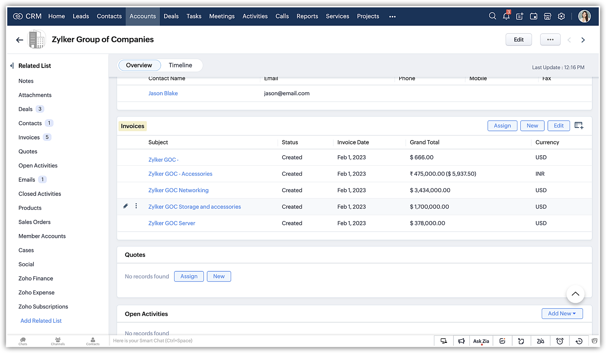 CRMの取引先タブでは、見込み客や顧客に関するビジネス情報を有しています。また、連絡先、商談、見積書、請求書、その他の情報を関連リストとして表示しています。