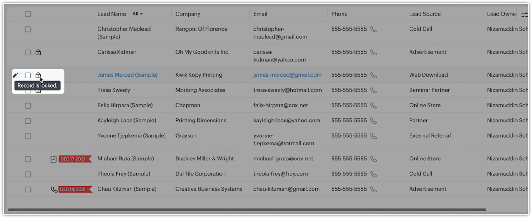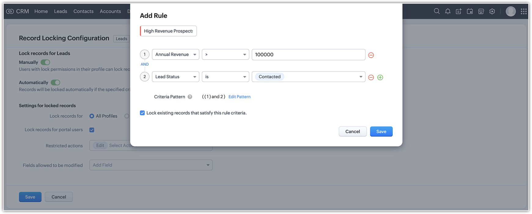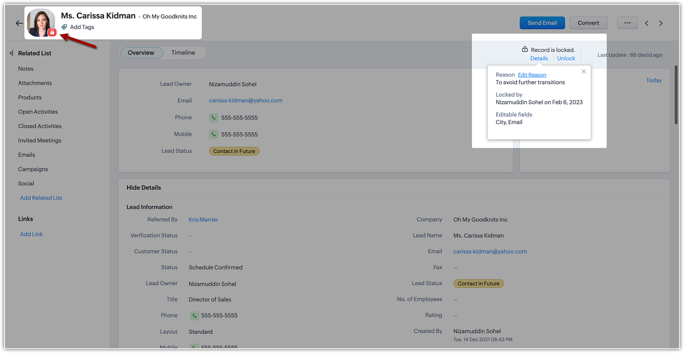 また、データが特定の条件に合致しない場合、そのデータを担当するユーザーは変更を避けるためにデータをロックしたい場合があります。例えば、ある営業担当者が見込み客と連絡を取っているとき、他の担当者がデータに誤った情報を追加するのを防ぐために、見込み客の精査中にデータを一時的にロックしたいと思うかもしれません。