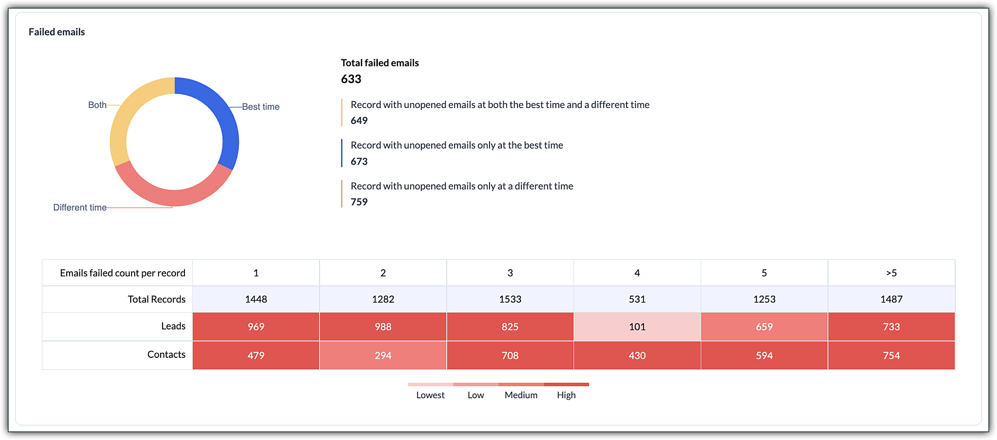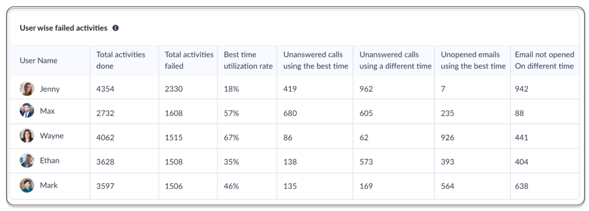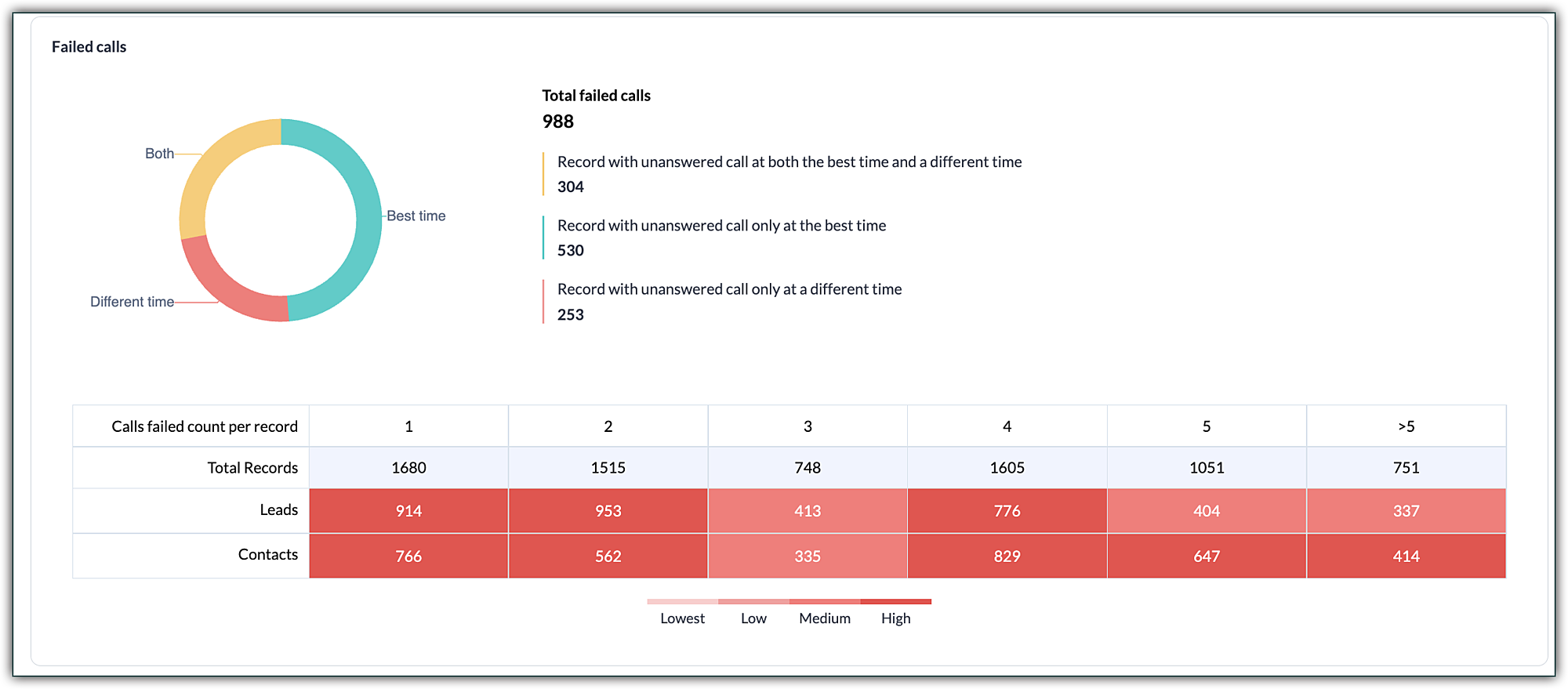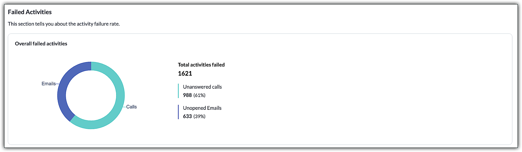 このセクションでは、通話やメールに関連するすべての失敗した活動について表示されます。失敗した活動には、未応答の電話、未開封のメール、および最適な時間帯で送信したにもかかわらず意図したとおりにコンバージョンできなかった通信が含まれます。これらの分析により、通信がそもそもなぜコンバージョンされなかったのか、また組織における失敗した活動の割合を確認することができます。