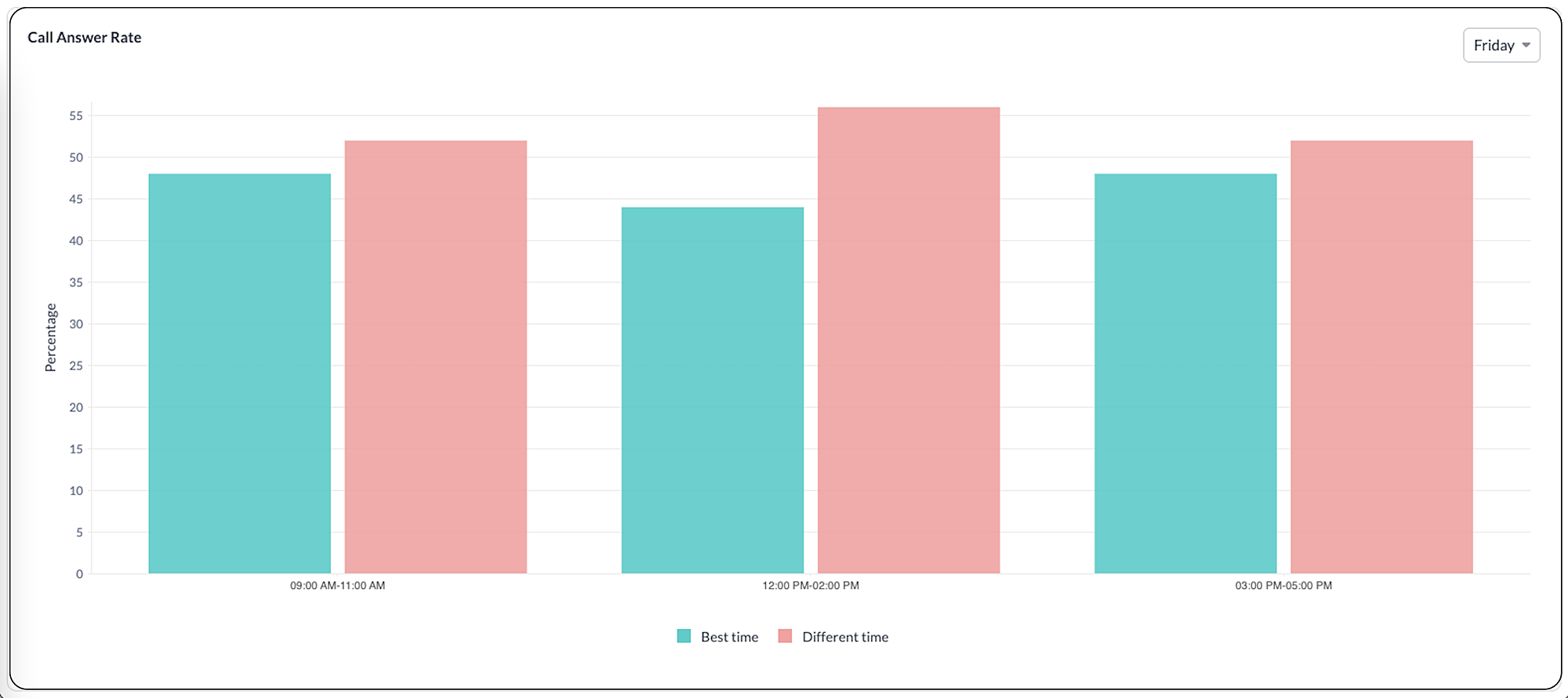 このグラフは、最適と提案された時間帯にかけた電話と、それ以外の時間帯にかけた電話の応答率を一対一で比較したものです。ある時間帯の応答率を視覚的に評価することができます。