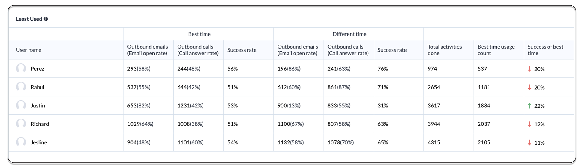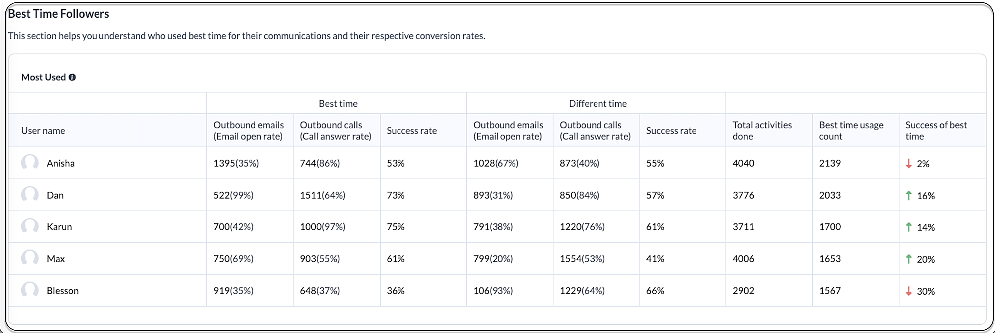 このグラフは、組織内のすべてのユーザーと各ユーザーの通信の指標を一覧表示します。各ユーザーの通信における最適な時間の利用率やコンバージョン率を確認することができます。