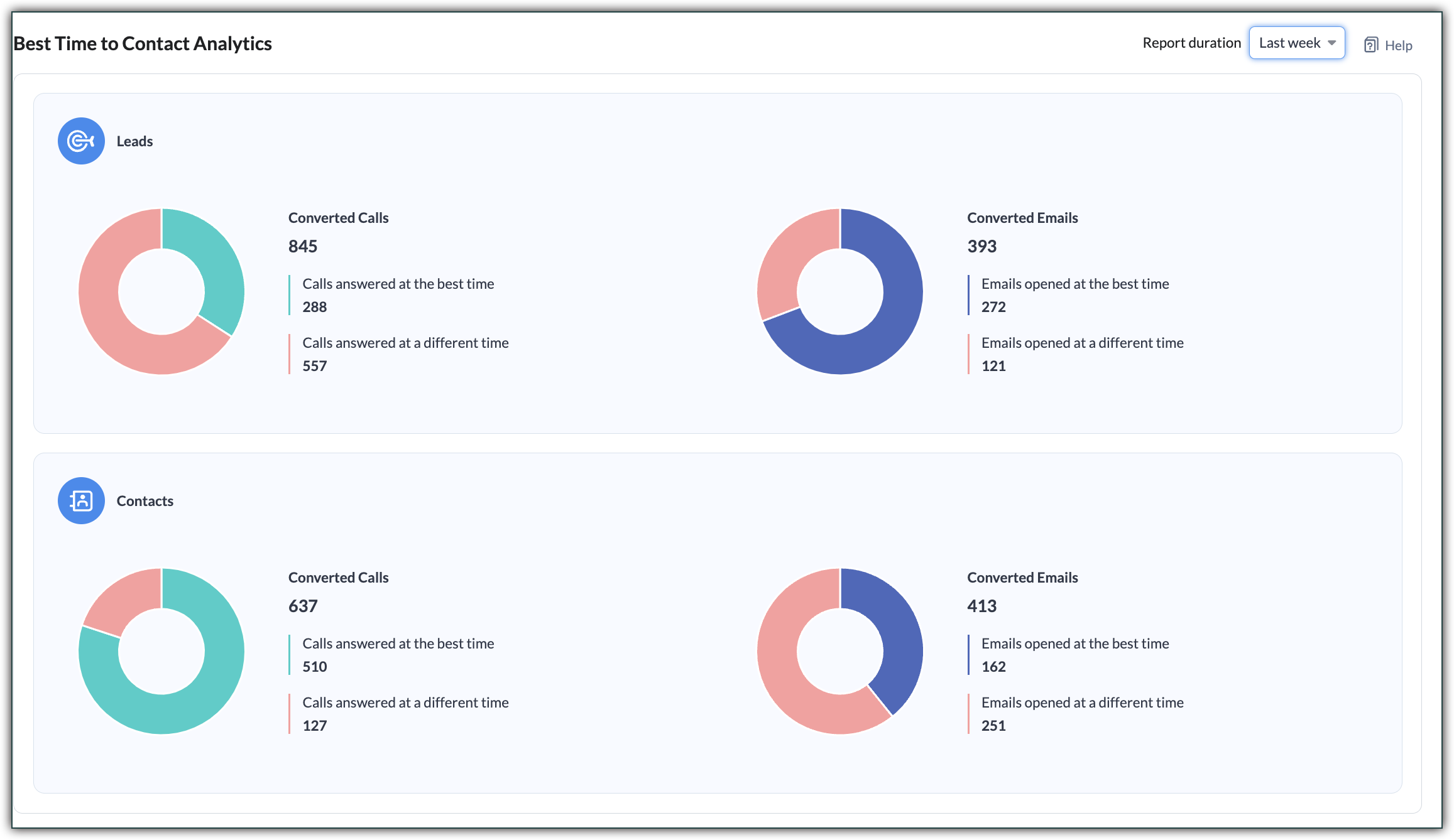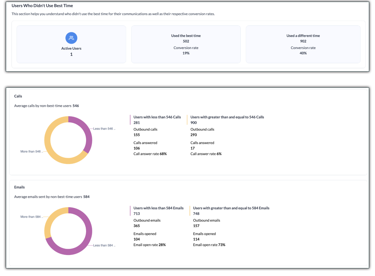 連絡に最適な時間帯の概要では、組織内で行われた通話とメールの概要を確認できます。このセクションでは、さまざまな種類の通信のパフォーマンス ー 特に最適な時間に行われた通話や電子メールと、それ以外の時間に行われた通信のパフォーマンスを比較します。この分析により、Ziaの提案が正確かどうかを判断することができます。