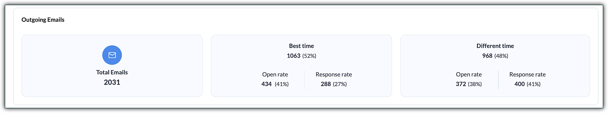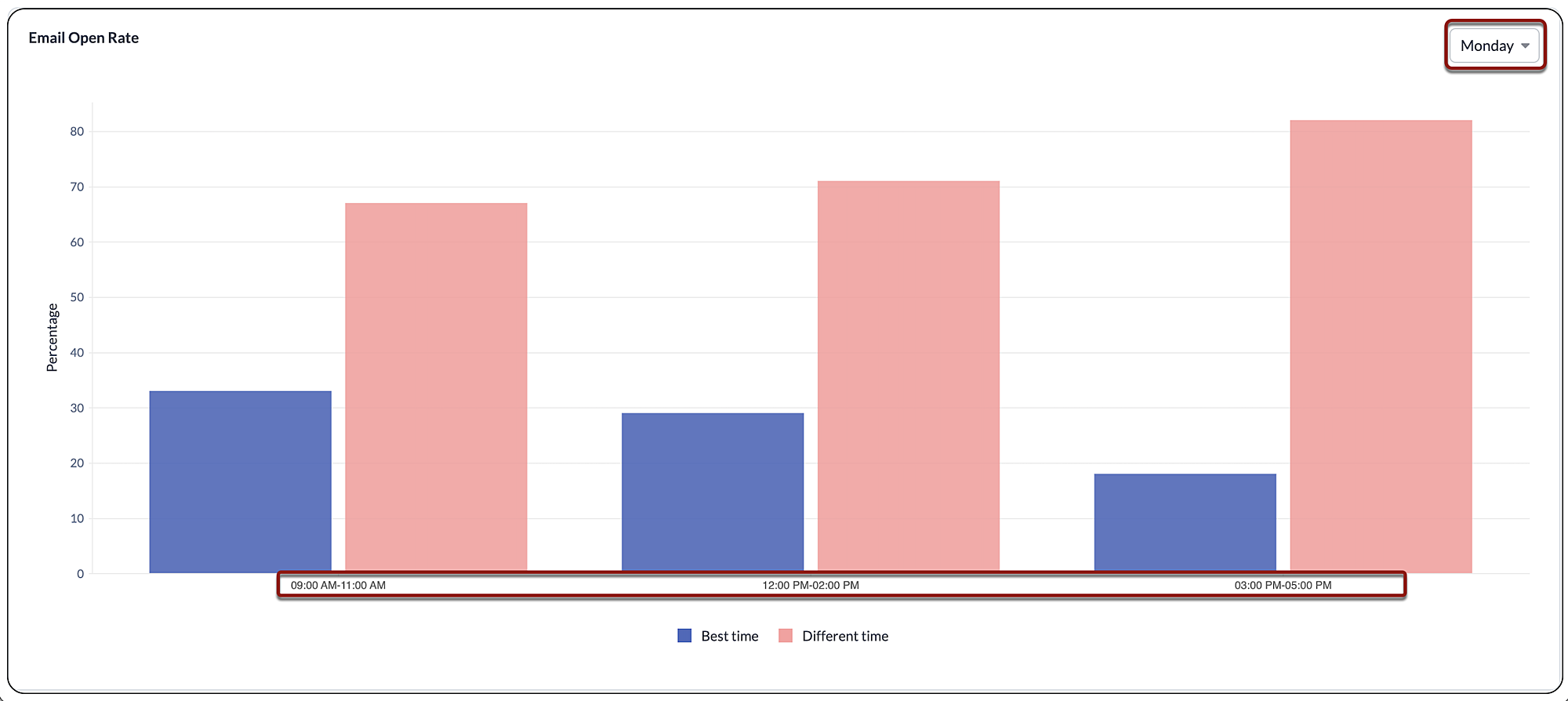 メール開封率は、通話応答率と同様に、コンバージョンに関する評価を示します。最適と提案された時間帯に送信した場合と、それ以外の時間帯に送信した場合のメールの開封率を比較することができます。