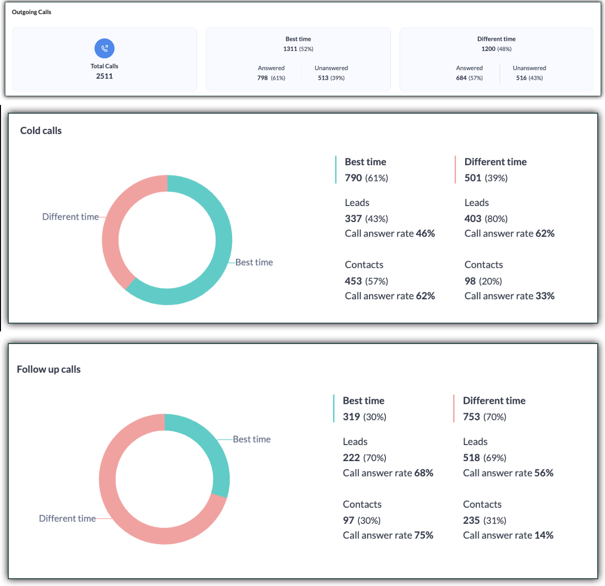 この分析では、発信電話を詳細分析します。この分析では、最適な時間帯に発信したものと、それ以外の時間に発信したもの、すべての発信のコンバージョン率(未応答だった通話と応答した通話)を表示します。