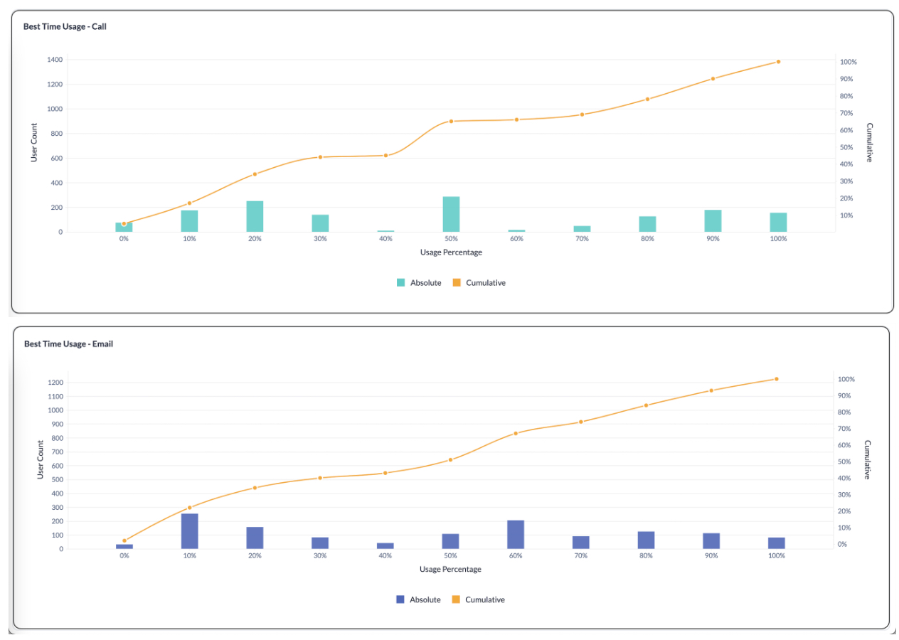 これらの表/グラフは、Ziaの「連絡に最適な時間帯」提案のパフォーマンス、効果、および使用状況を評価するのに役立ち、十分な情報に基づいた意思決定を可能にします。
