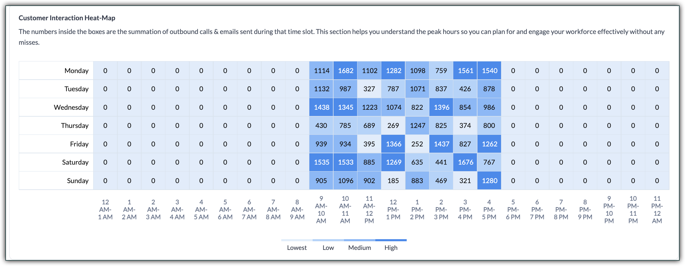 この表は、組織における通信のピーク活動時間を示す活動マップです。ビジネスにおける通信のパターンを評価するのに役立ちます。