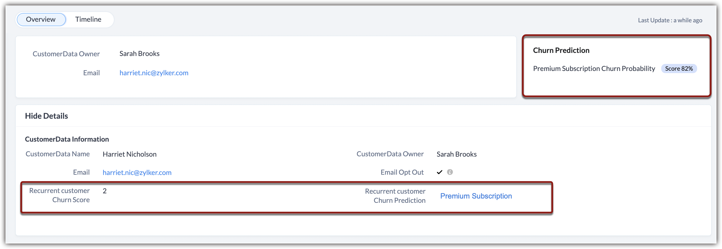 予測スコアに基づいて行動できるように、Ziaは定期課金(サブスクリプション)型のビジネスモデルのデータ詳細画面に、読み取り専用の2つのカスタム項目を表示します。