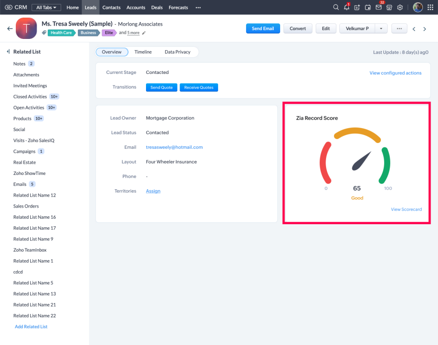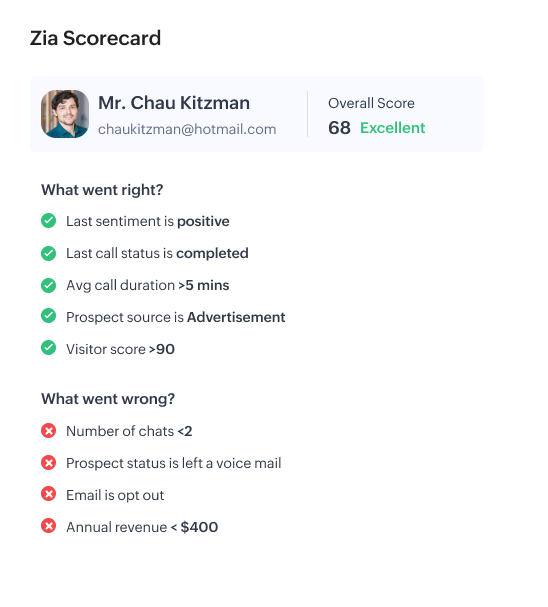Ziaがデータを分析するのに通常数分から24時間かかり、スコアは、「Ziaスコア」というカスタム項目に保存されます。スコアは、「改善が必要」、「良い」、「とても良い」の3つに分類されます。