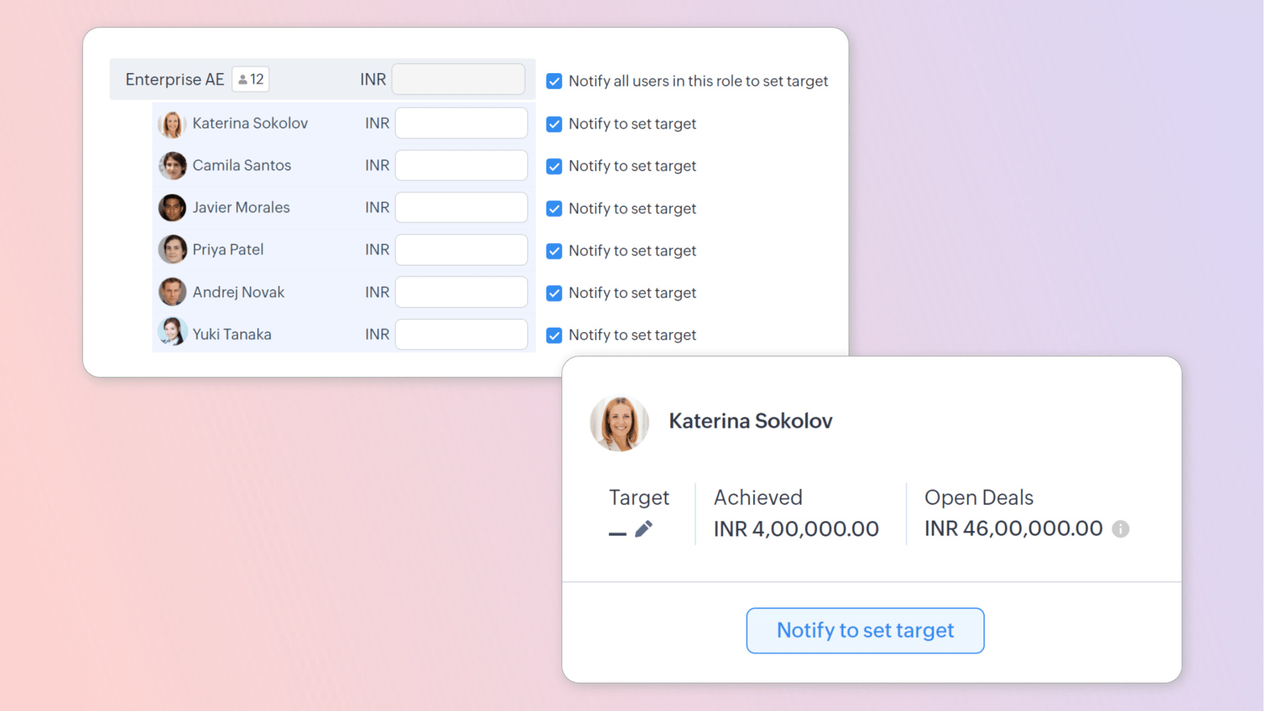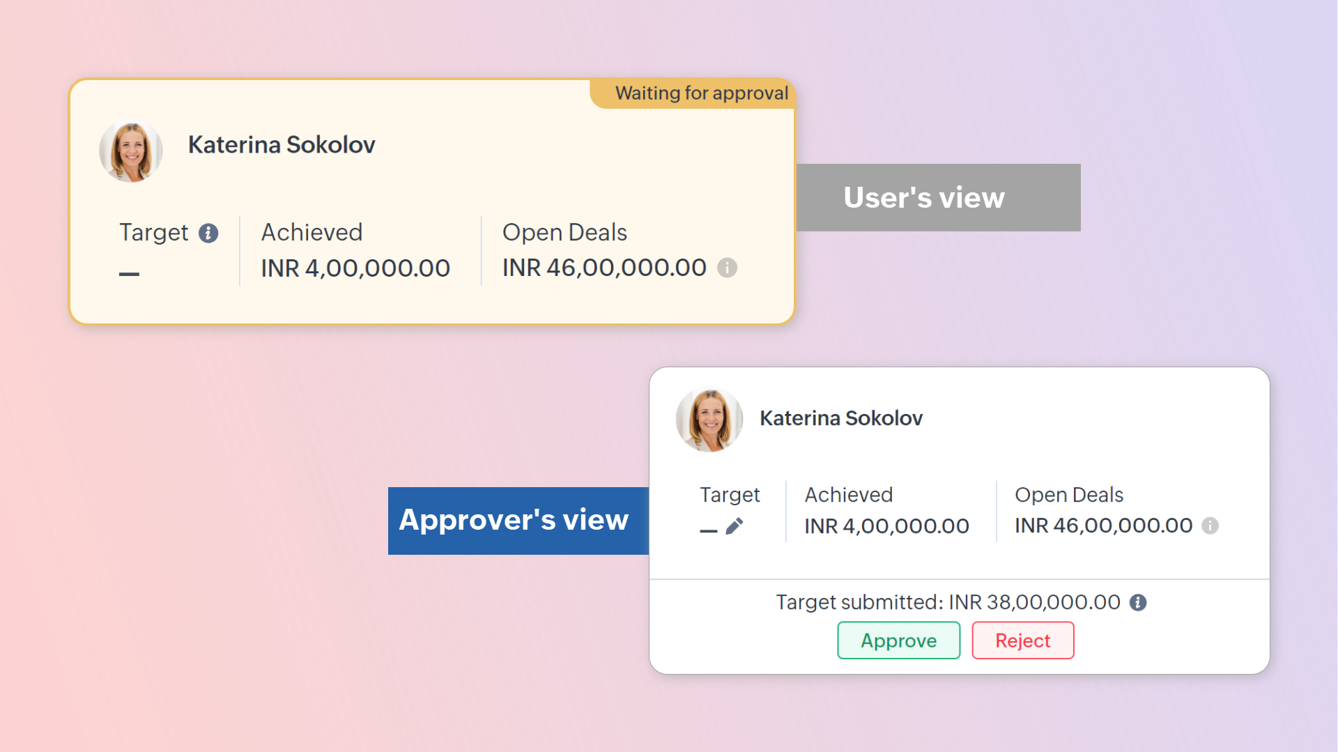 このような方法で目標を設定するオプションが、Zoho CRMの売上予測で利用可能になりました。下位の階層のユーザーは目標を設定し、売上予測の管理者や管理者に承認してもらうことができます。