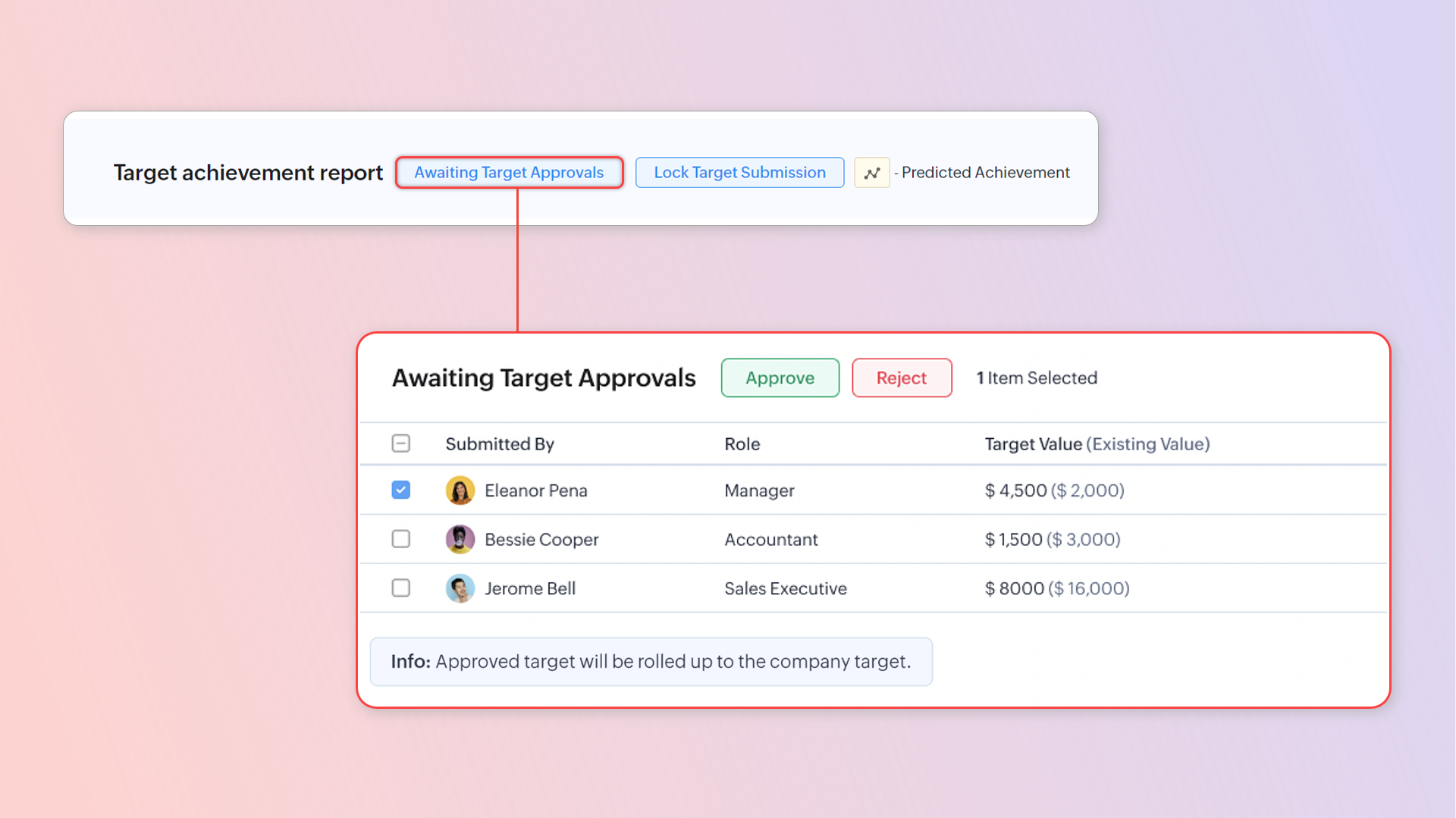 管理者は、複数ユーザーの目標の承認/却下を簡単に行うために、一括で承認または却下することができます。