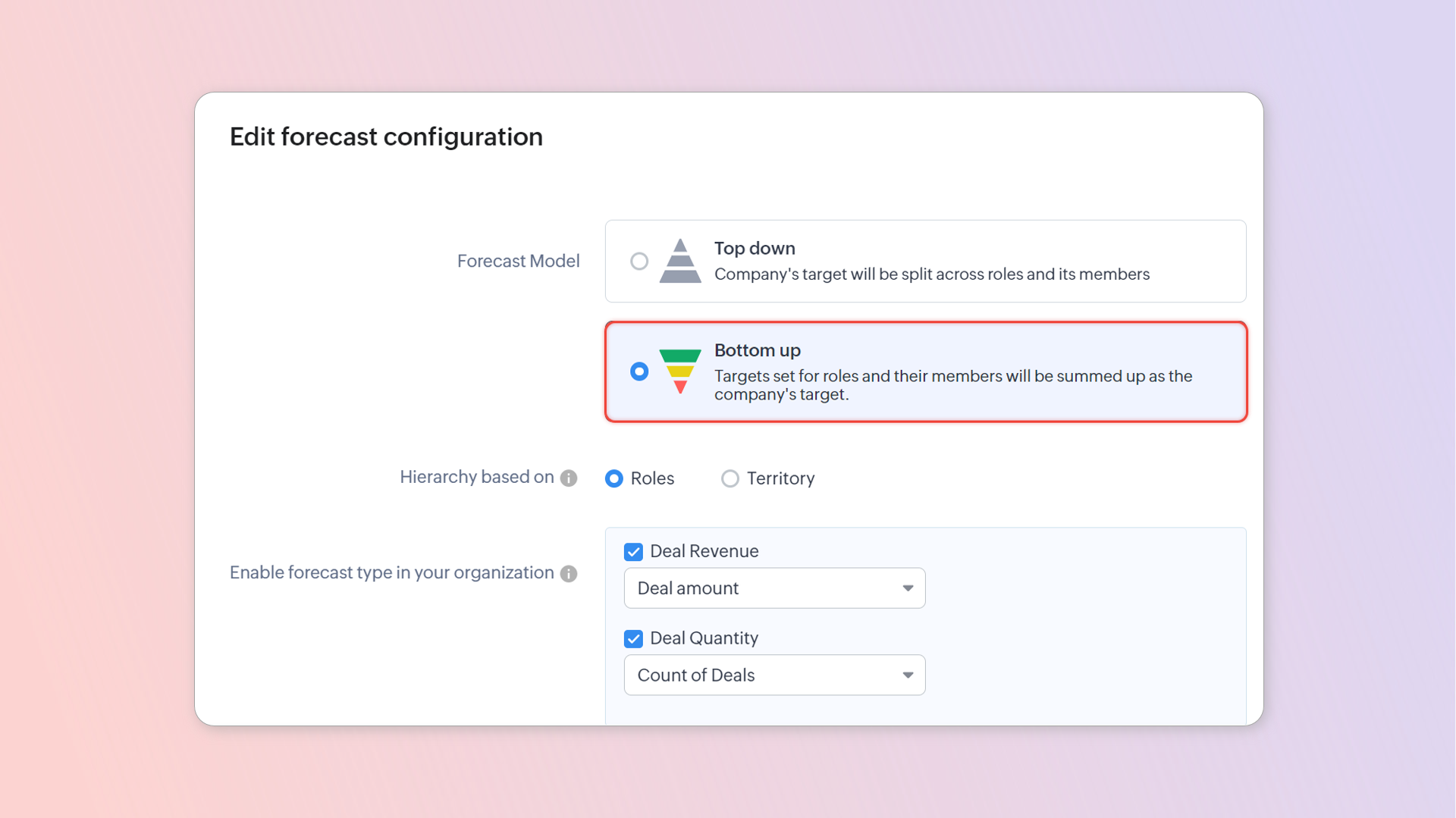 Zoho CRMの売上予測の種類として、「トップダウン(上から)」もしくは「ボトムアップ(下から)」オプションを選択できるようになりました。