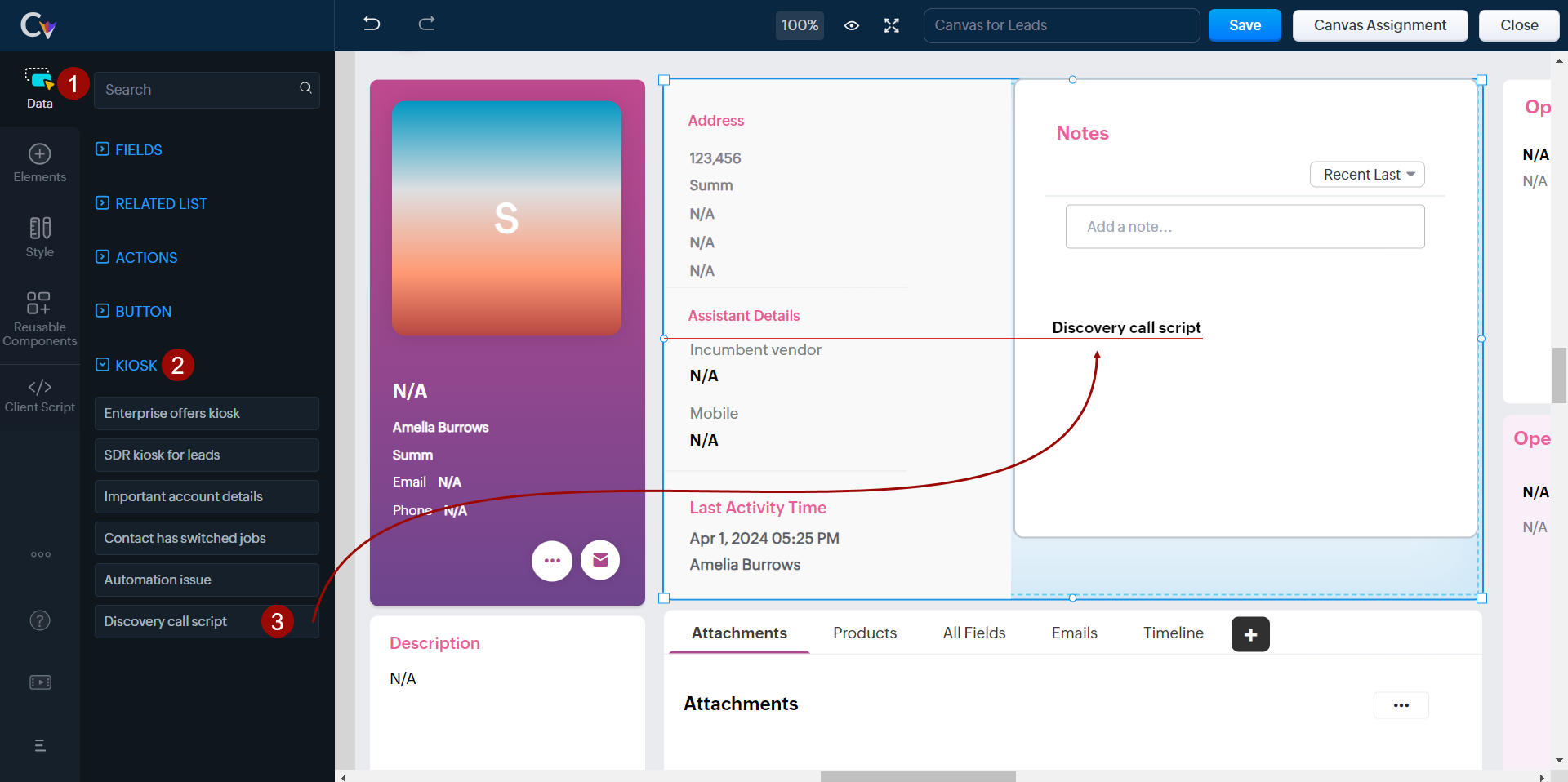 キオスクをキャンバスのデータ詳細画面に直接配置する