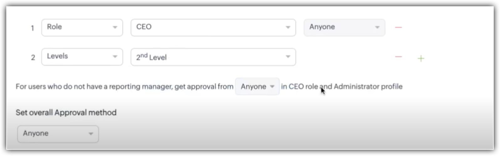 承認に2つ以上の段階があり、承認者の範囲を[すべての承認者]に設定した場合、直属の上司がいないユーザーは、階層内の上位のユーザーの[いずれかの承認者]または[すべての承認者]を選択するか、CEOと管理者から[いずれかの承認者]または[すべての承認者]を選択して、データの承認を得ることができます。