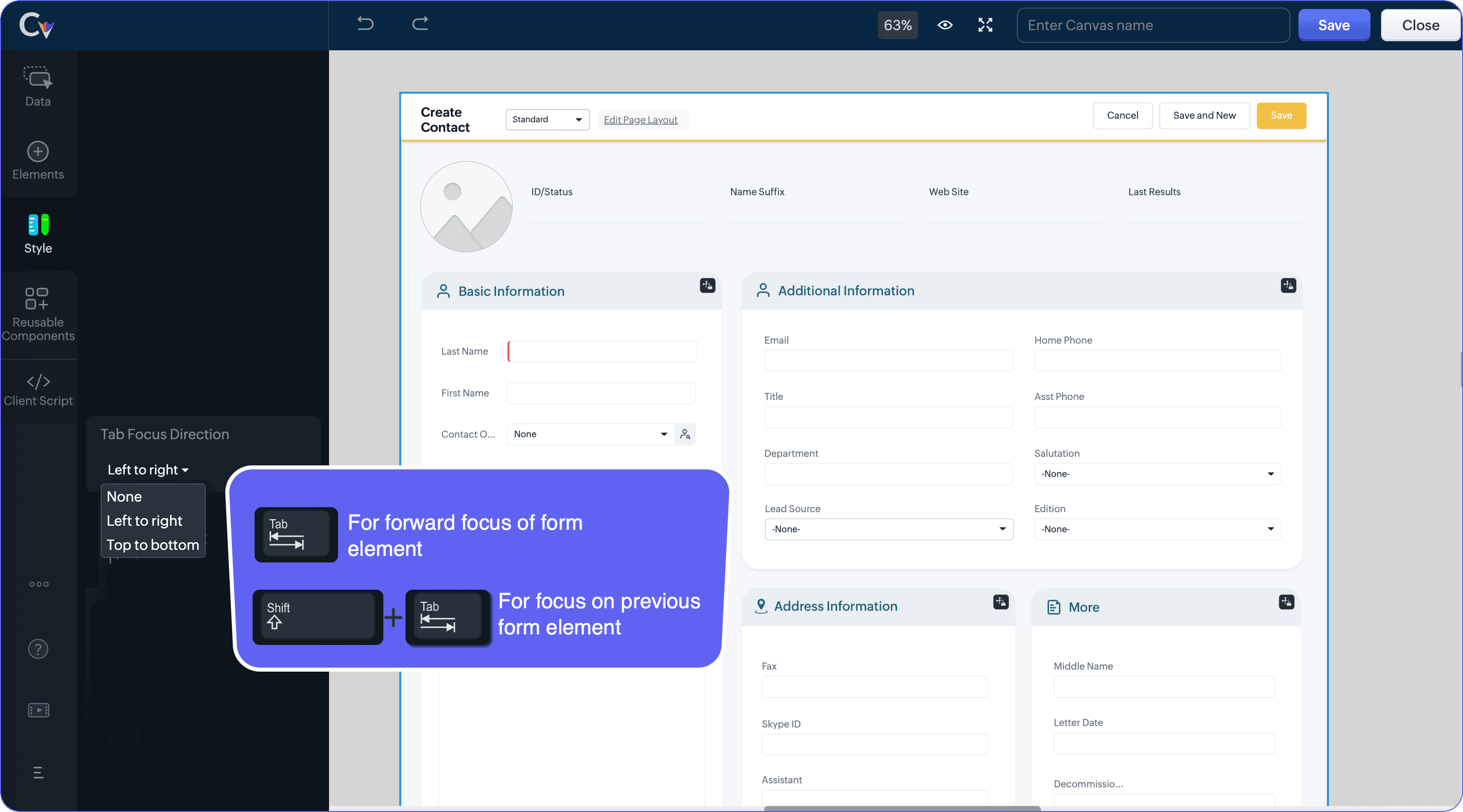 フォーム入力の習慣に基づいて、タブフォーカスの移動方向を、左から右、または上から下へ設定できます。同様に、Shift+Tabキーのショートカットを使って前のフィールドに移動することもできます。キャンバス内の各コンテナに対してタブフォーカスの方向を決定することも、ページ全体に適用して、子コンポーネントは親コンポーネントの設定に従うようにすることもできます。