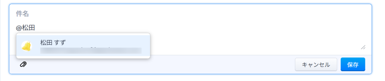 @メンションをするには、@(半角)入力後、メンションしたいユーザーのメールアドレスもしくはユーザー名を入力すると、ユーザー候補が表示されますので、@メンションをしたいユーザーをリストから選択してください。