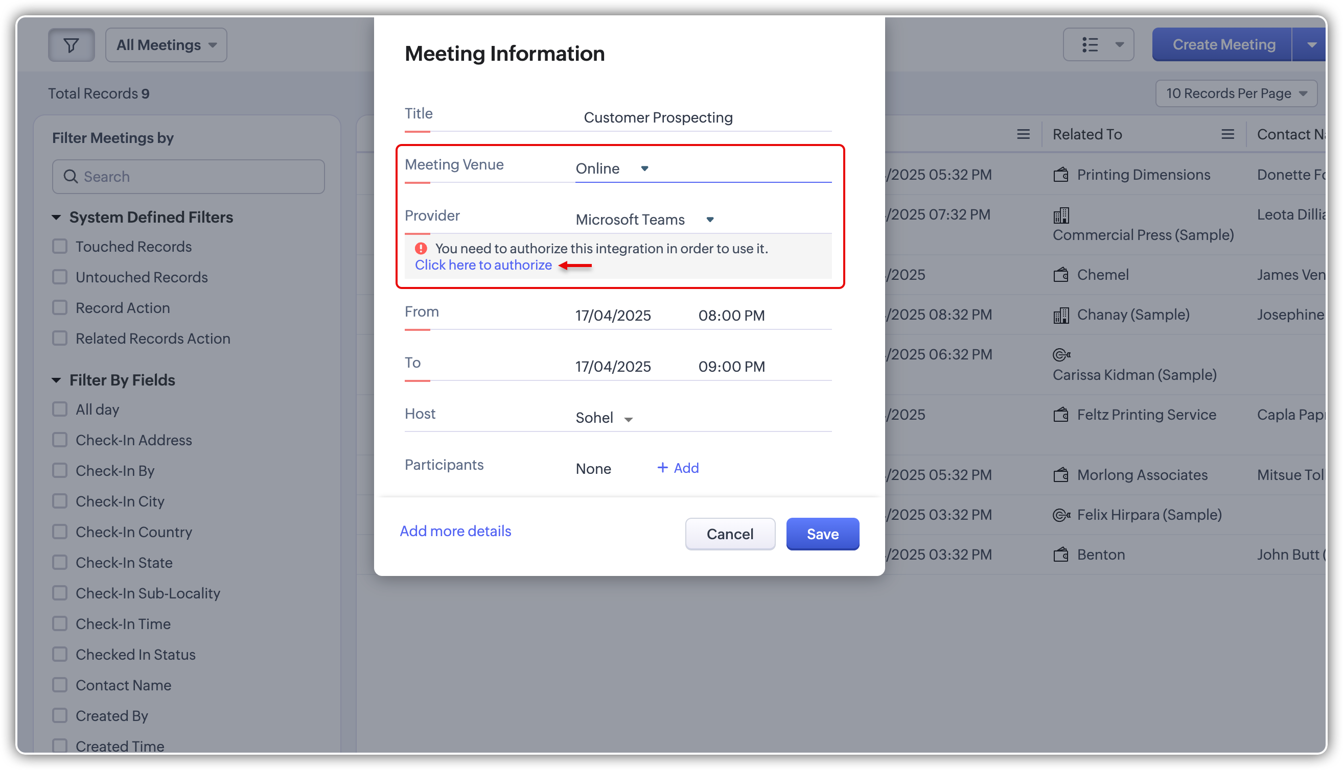 簡単な認証後、Zoho CRMから直接Microsoft Teamsミーティングをシームレスにスケジュール設定・管理できるようになります。