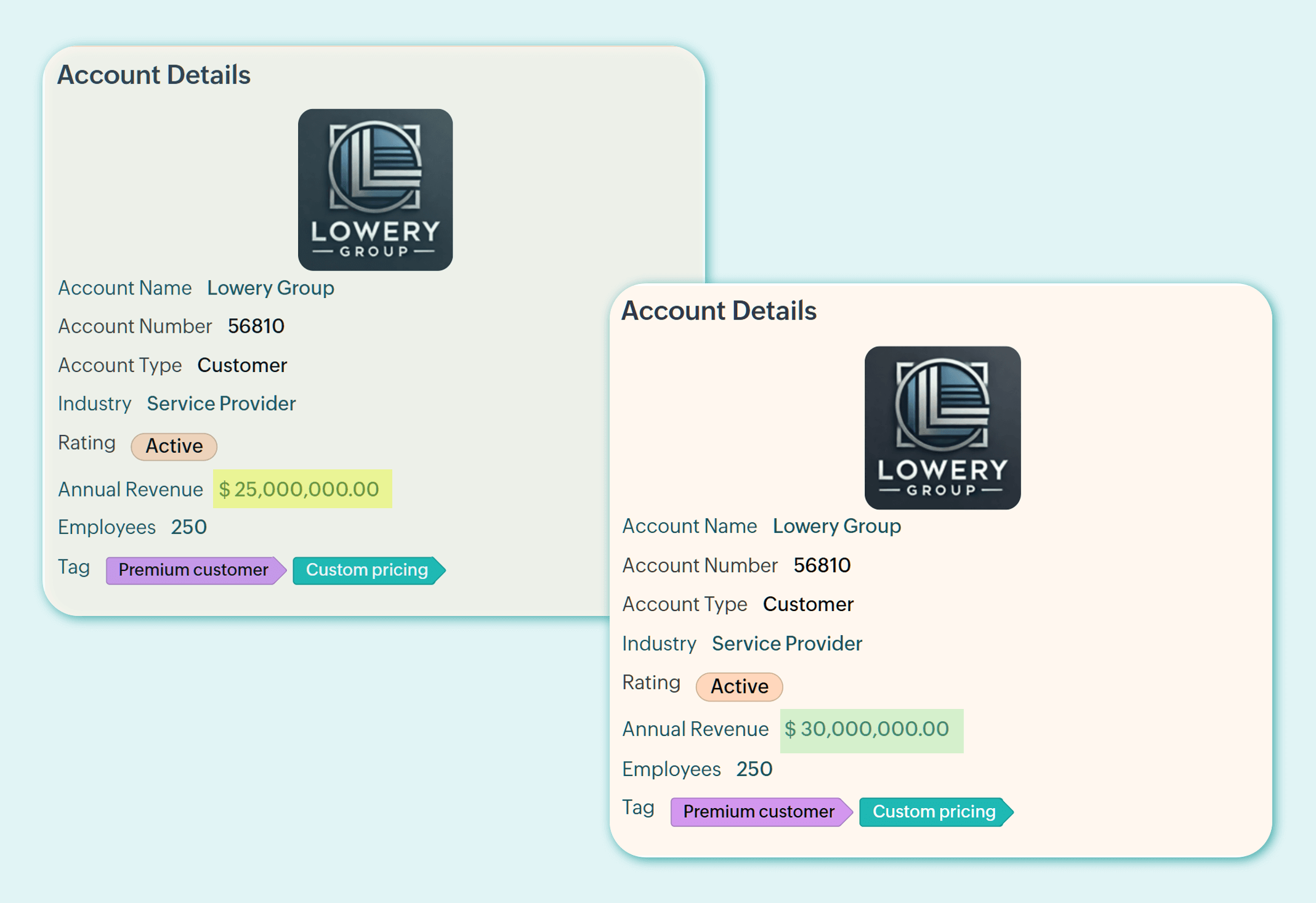 営業担当者は、注目すべき商談を見つけたら、そのデータをクリックし、商談の詳細表示ページで、業種、規模、年間売上とともに、その他の重要な取引先の詳細を即座に確認することができます。以前は、新しいタブで取引先データを開き、切り替えなければなりませんでした。