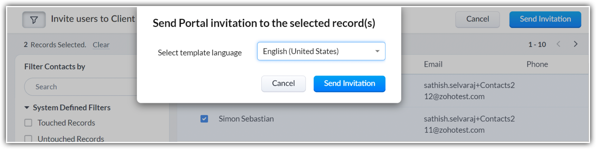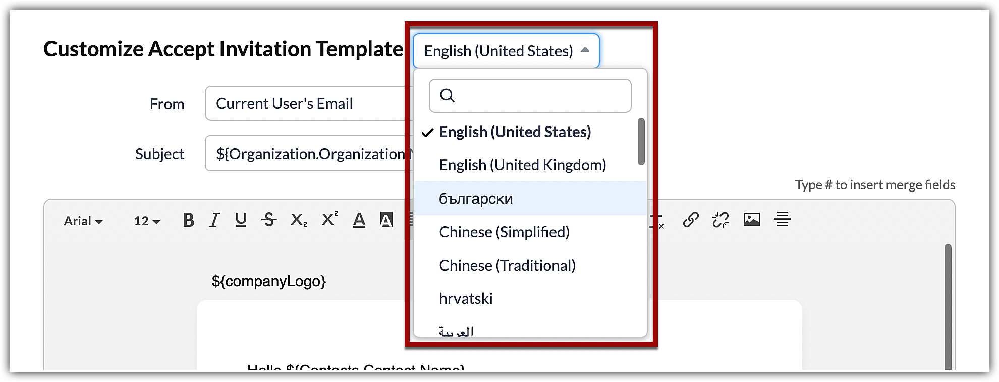 選択した言語にて保存されているテンプレートが使用され、招待メールが送信されます。